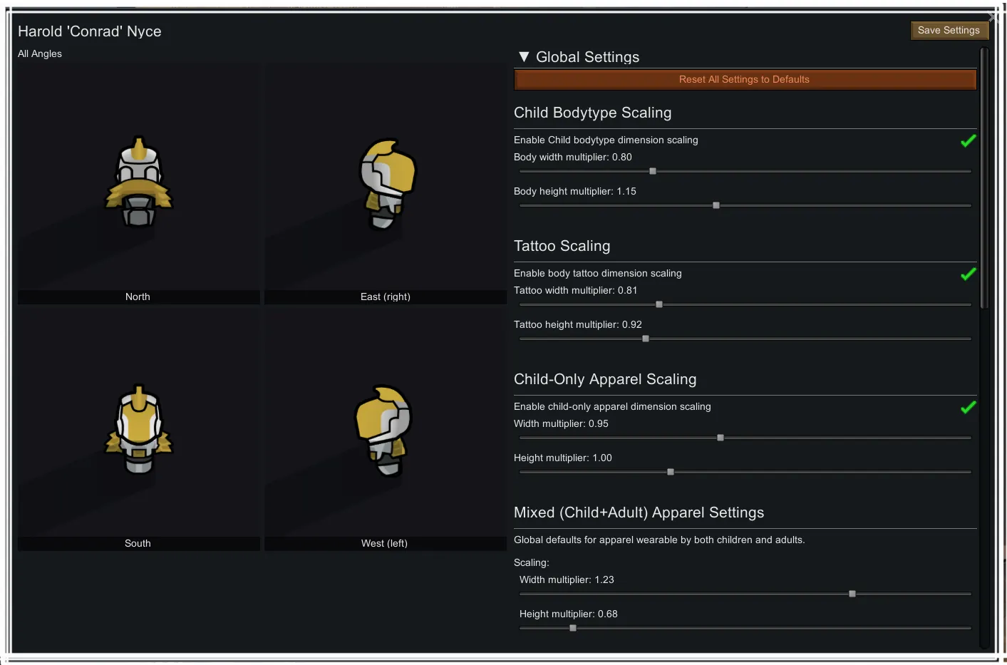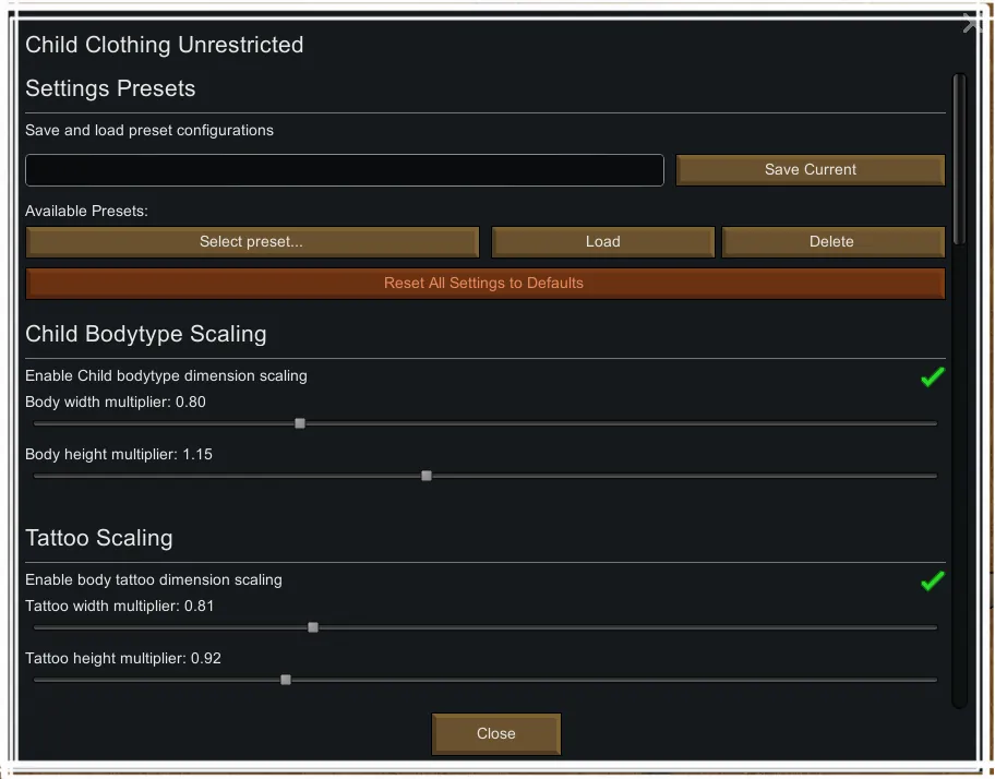 - Separate scale controls for mixed apparel, child-only apparel, body mesh, and tattoos