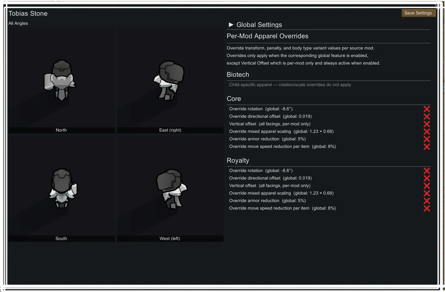 - Each apparel mod can have its own rotation, scale, offset, and penalty values