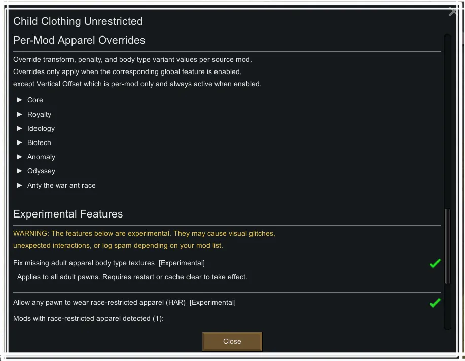 Tired of children being stuck with a handful of kid-specific clothes? This mod removes all apparel restrictions for child pawns — they can wear any outfit, armor, or gear, just like adults.