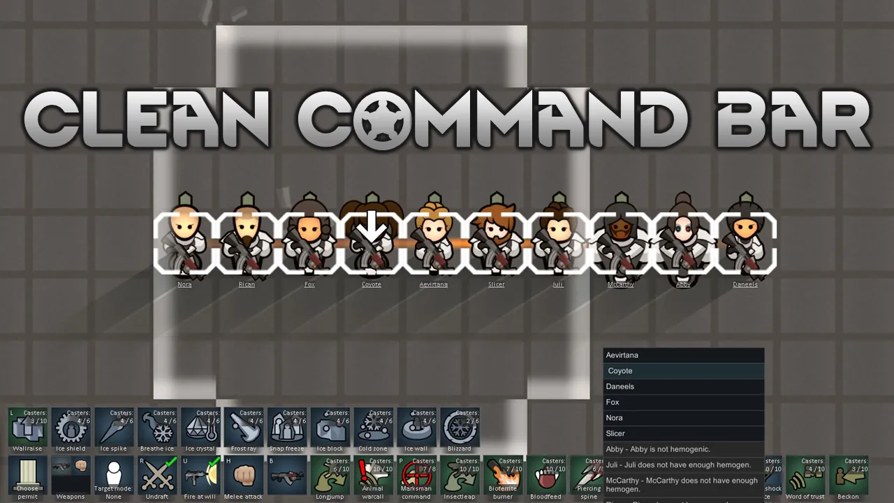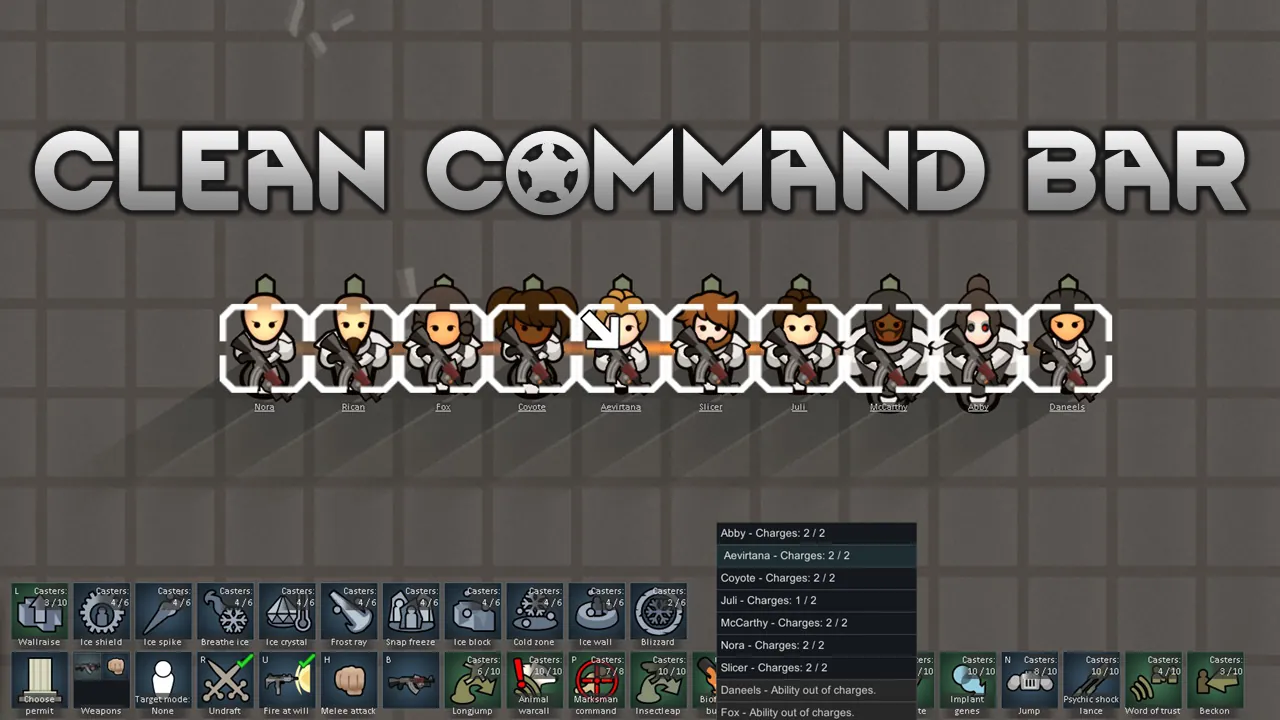 Designed to support most mod-added abilities. It processes virtually any Ability or Command button built on the Vanilla system. If it shows up on a pawn’s bar, it can be grouped.