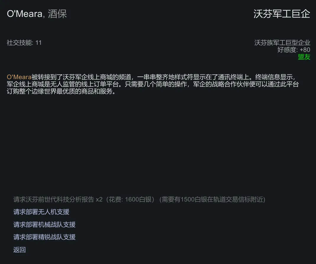 A total rework of the Mega Corp comms console interaction. You can now pay for military aid or donate for relationship.