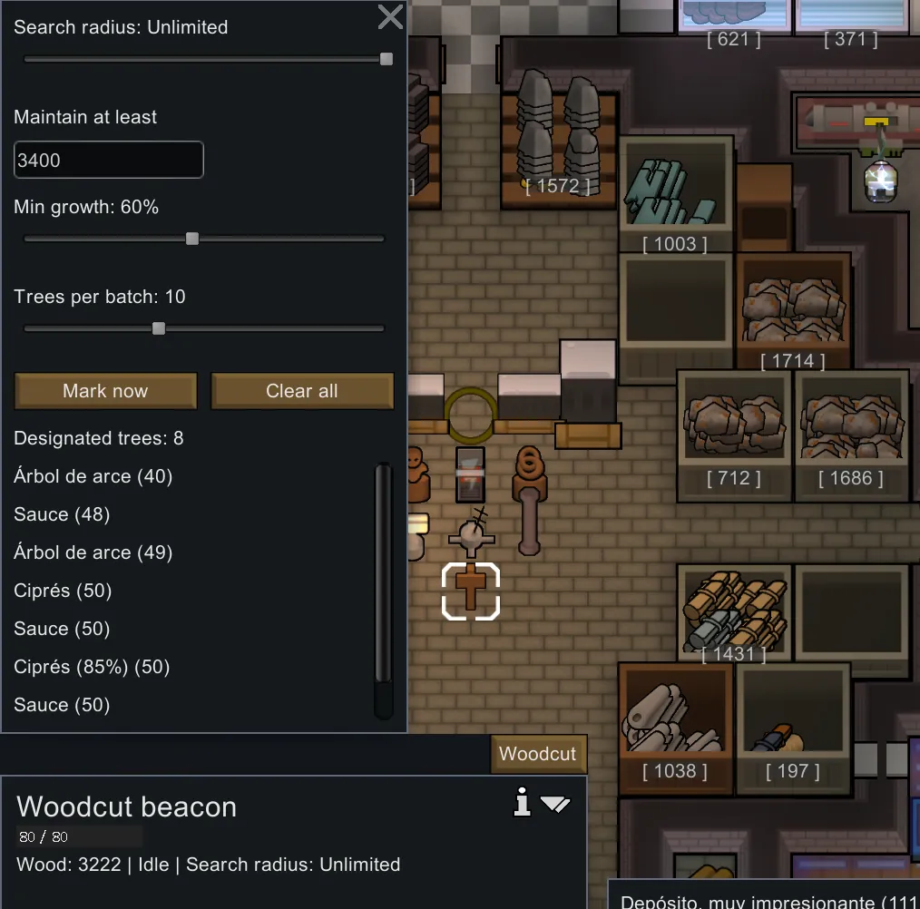 Tired of pausing the game every time to manually mark trees for chopping? Place a beacon, set your minimum wood stock, and let it handle the rest.