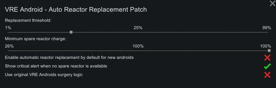 [*] If the option is enabled, a critical alert will appear when an android needs reactor replacement but no suitable spare reactor is available