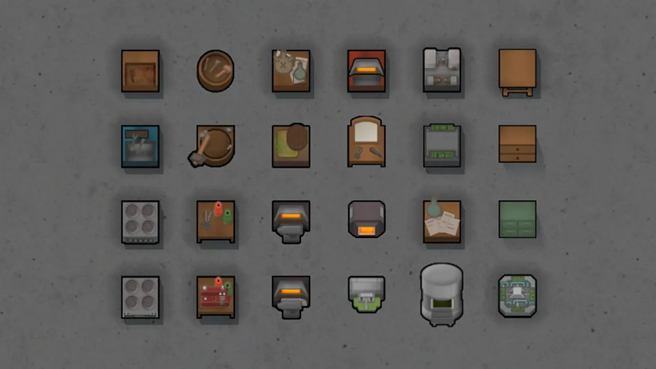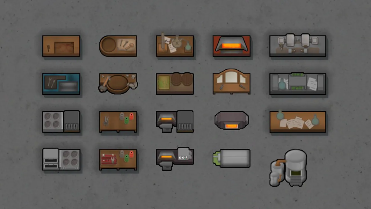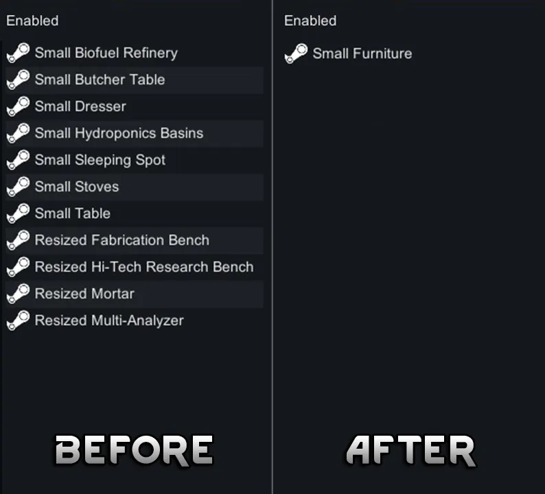 A customizeable mod that adds small and medium furniture and workbenches, either as new variants or as resizes of existing buildings, configurable in mod options. In general, small buildings are 1x1 and medium are 2x1, and they have a workspeed of 70% and 40% that can be changed in settings.