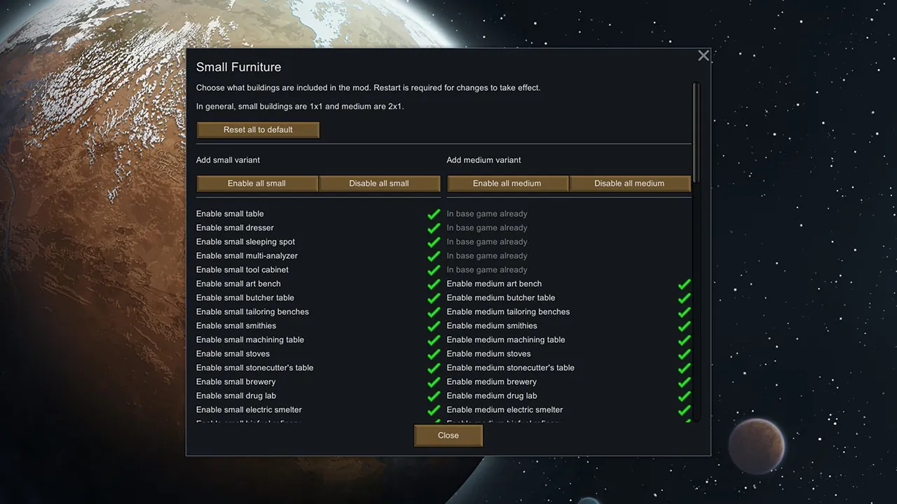 If you've previously used mods from the small furniture series, this mod is made to replace and expand on those, and can be safely replaced with this mod without disappearing. If you want to set the settings to be equal to the previous mods in the series, there's a button for that at the bottom of the mod options.