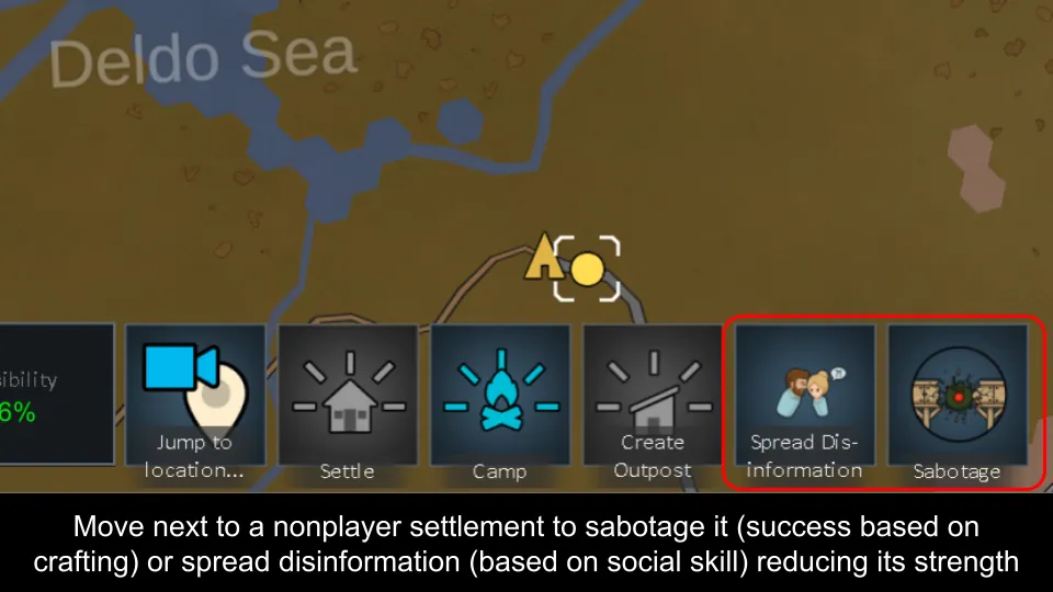 [*] To perform actions like "Sabotage" or "Spread Disinformation" or "Fortify Action" move to a cell directly [b]next[/b] to a NPC settlement (do not move to the settlement directly!)
