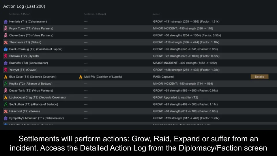 [*] [b]NPC world map actions[/b]: All nonplayer settlements will perform actions throughout the day. They will either try to grow (increase their strength or expand), attack an enemy settlement (just like your outposts & vassals) or be subject to an incident reducing their strength. Actions are equally spread out over the day to save performance