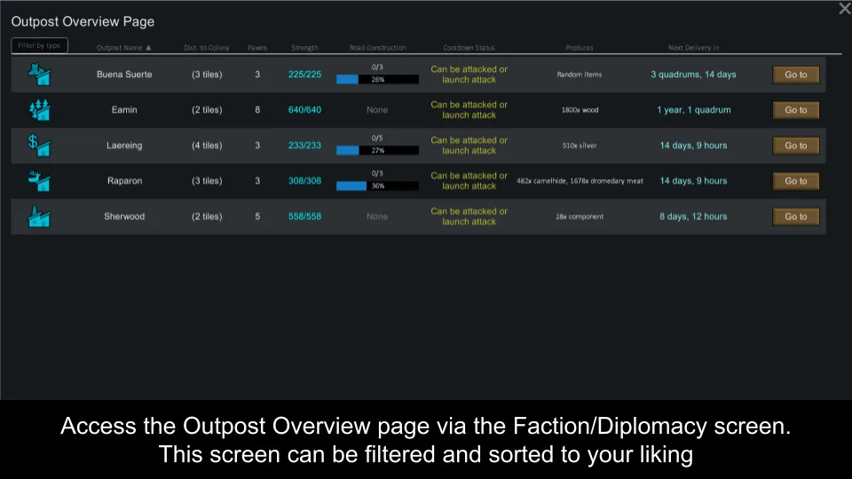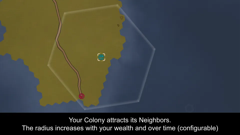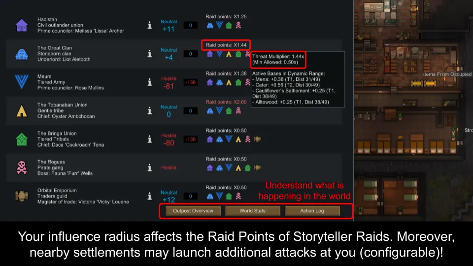 [*] [b]Raids on the Player[/b]: Having enemy settlements in your vicinity makes a huge difference now. They a) scale the strength of Story Teller raids (applying a multiplier to the raid points) and nearby enemy settlement might b) launch additional raids on your base. Your influence radius can be visualized by clicking your Colony on the world map. And the raid point multipliers of each faction can be seen on the factions/diplomacy screen.