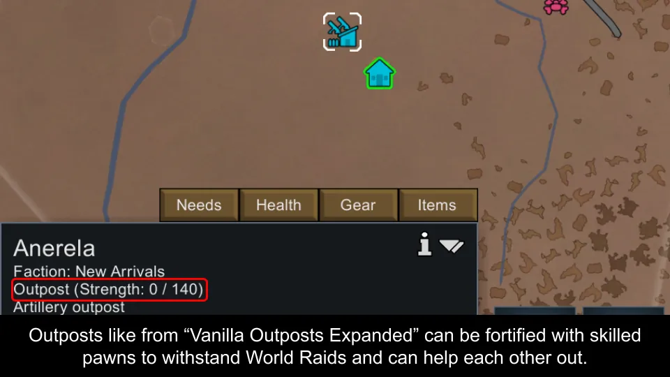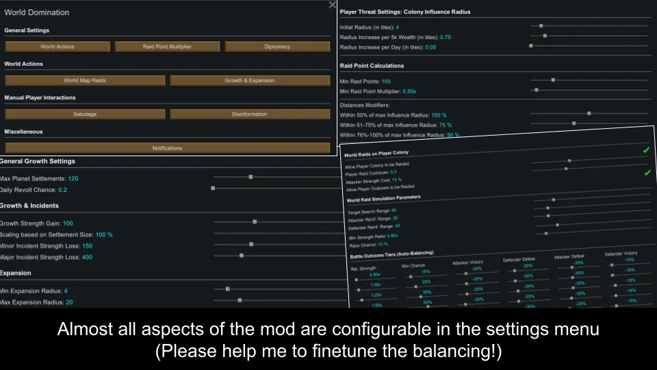 The goal of this mod is to add Total War like functionality to Rimworld without sacrificing performance. It is inspired by Rimwar but much more lighweight. All actions performed by the mod are spread out over time and most things are just simulated simple math. There are e.g. no on map raider caravans