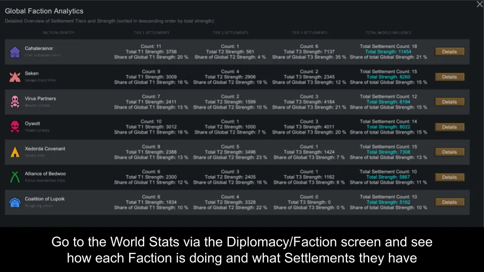[*] The raid multiplier per faction is affected by settlements in the influence radius of the player's colony. The closer the settlement, the higher the impact. The higher the Tier level of the settlement, the higher the impact. Be careful where you place your base! With some enemy settlement nearby, the raid points may get out of control quickly when they attack! Click your base on the world map to see its influence radius