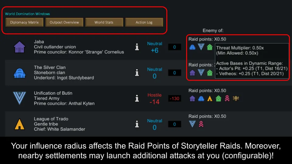 [*] [b]Raids on the Player[/b]: Having enemy settlements nearby scales the strength of story teller raids. Moreover, nearby enemy settlement might launch additional raids on your base. Your influence radius can be visualized by clicking your Colony on the world map. And the raid point multipliers of each faction can be seen on the factions/diplomacy screen.