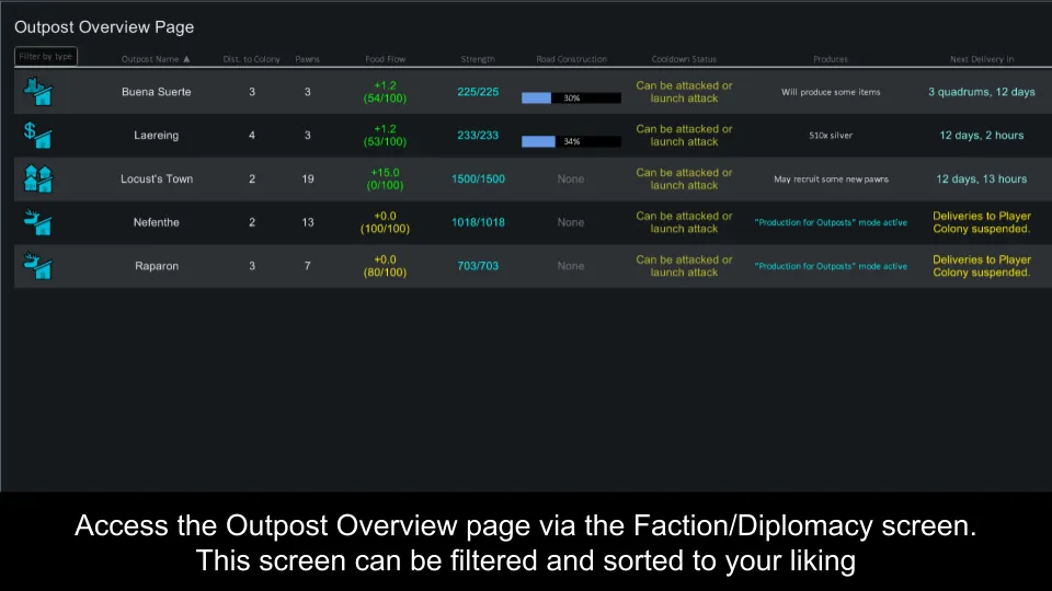 The goal of this mod is to add Total War like functionality to Rimworld without sacrificing performance. Settlements will launch Caravans to raid, expand or build roads. It is inspired by Rimwar but much more performance-friendly and it introduces a ton of cool stuff for Outposts from Vanilla Outposts Expanded.