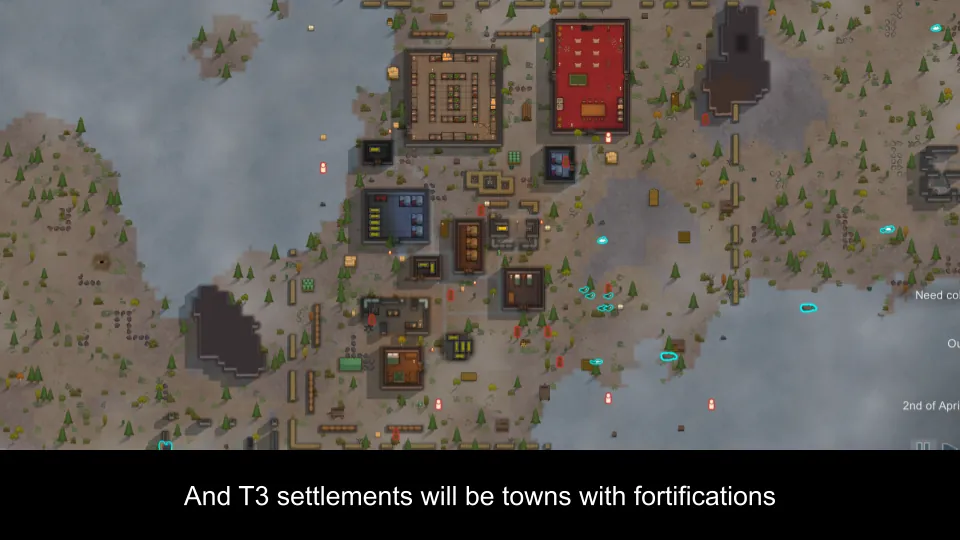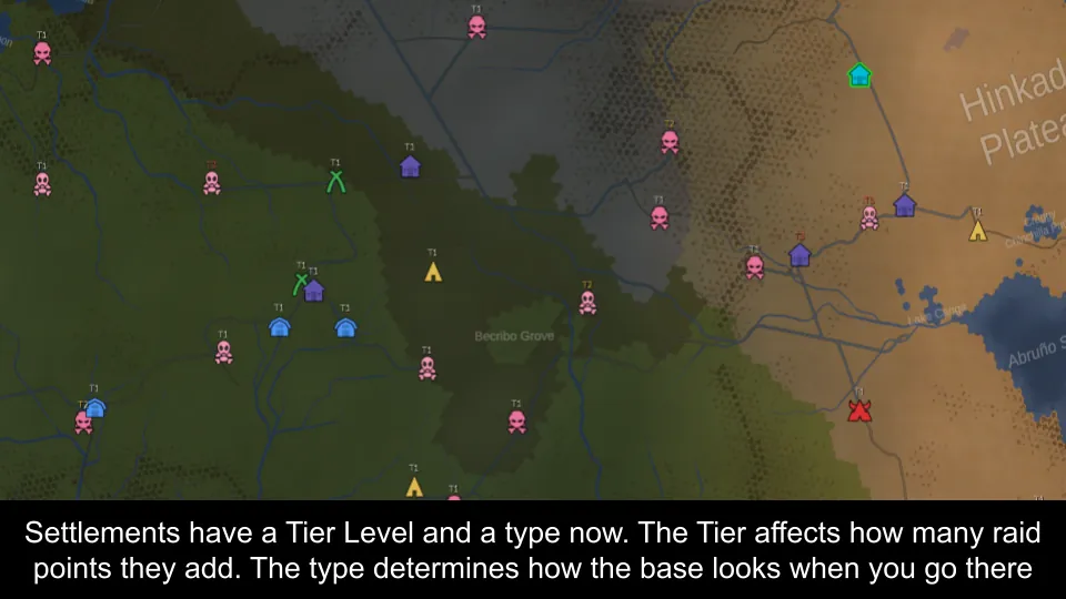 [*] [b]Tiered enemy bases[/b]: Each nonplayer settlement has a tier and a type now (logging, mining, slavery etc.). Higher tiers mean more raid points. So does the proximity. The base type affects how the base will look if you go there and how much resistance you will encounter
