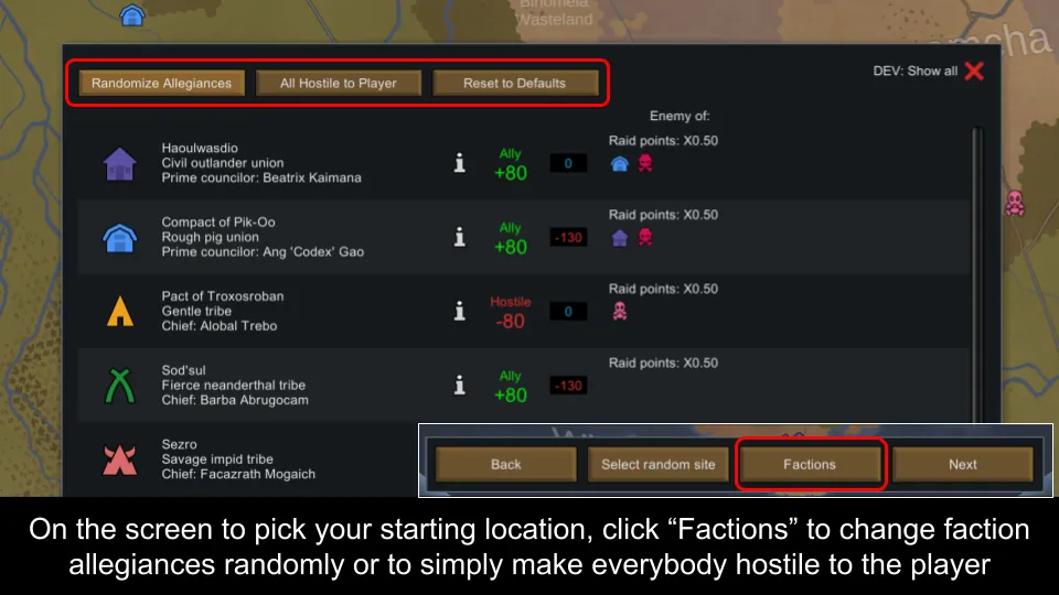 [*] [b]Basic NPC diplomacy[/b]: Non player factions may start a war with each other or become allies. The world leader will suffer from handicaps. Weak factions may form alliances against them. And the underdog benefits from buffs. Randomize the allegiances between all factions and the player by clicking the "Factions" button on the world map screen when you pick your starting location