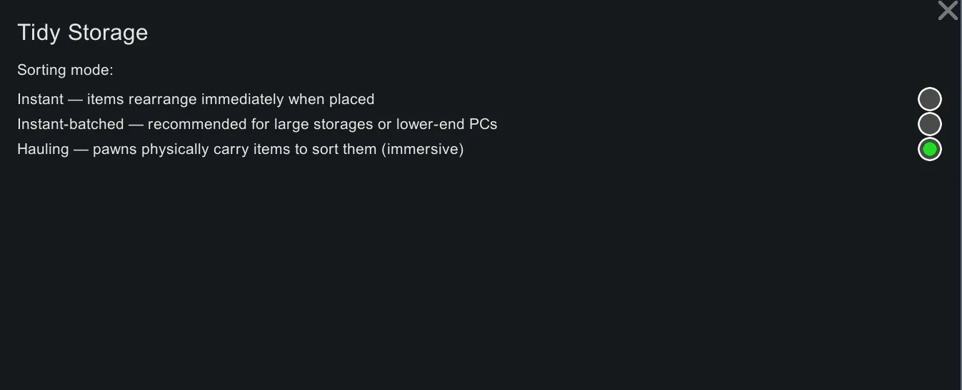 [*] [b]Hauling[/b] — pawns physically carry items to sort them. Immersive: one pawn locks the storage and executes the full sort plan sequentially