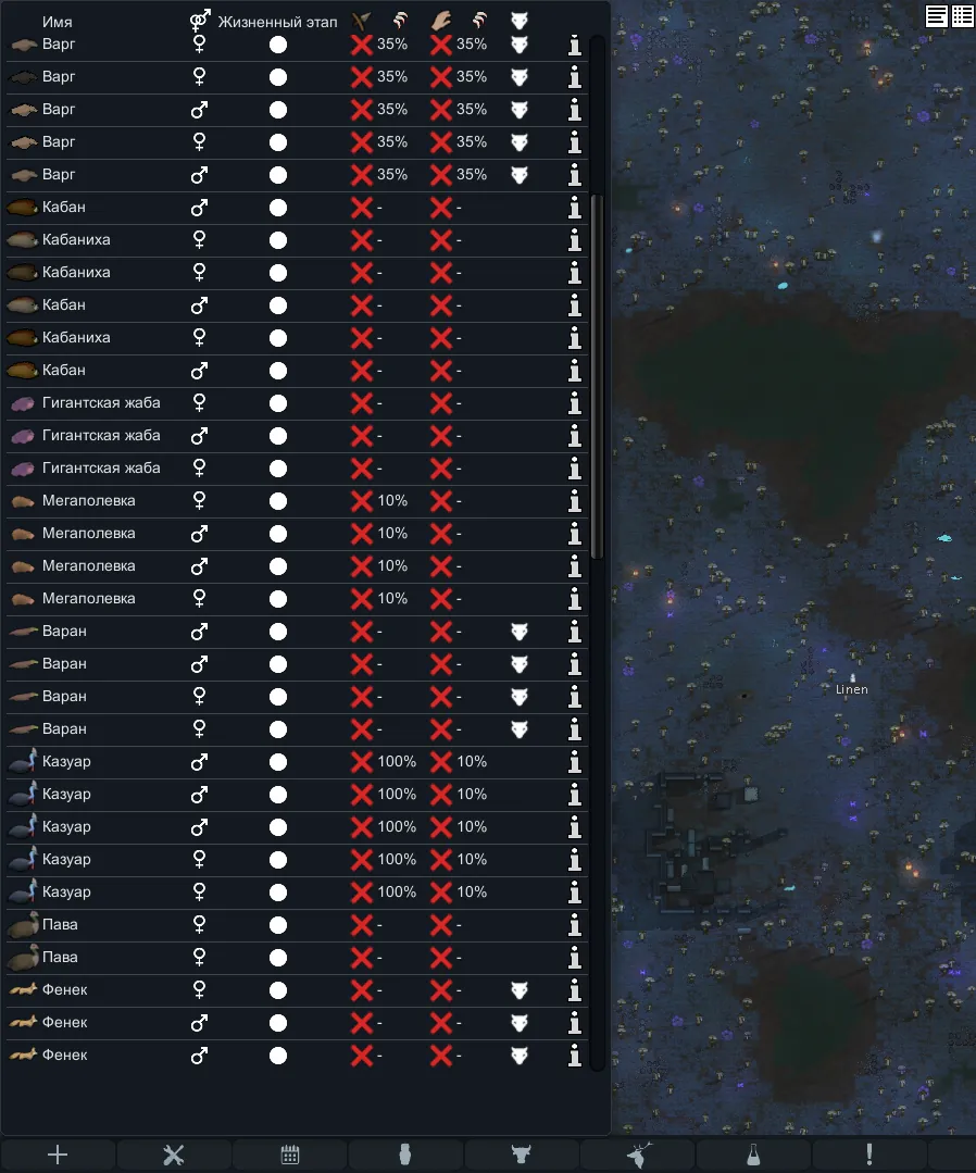 Significantly increases the amount of vegetation and trees. Increases the presence of predators. Significantly strengthens the skin of predators and large mammals; Improves the comfort and beauty of the skin of some stronger animals (by a maximum of 30%, which is almost insignificant compared to the effect of workmanship). Increases the likelihood of diseases.
