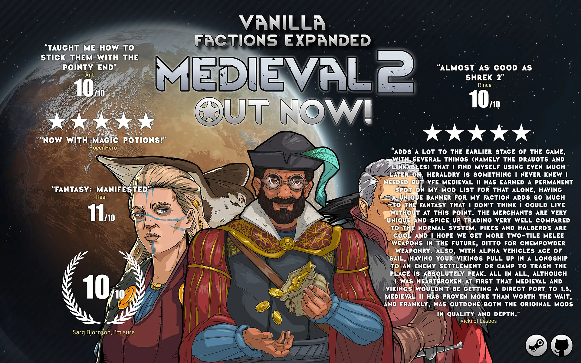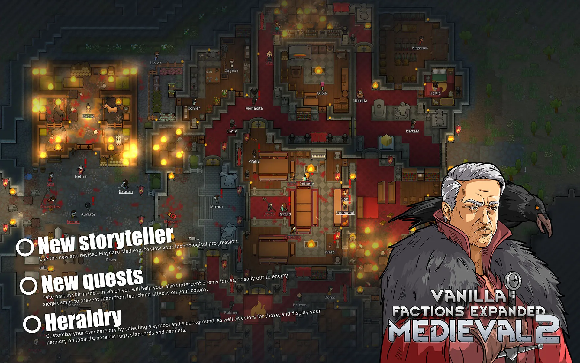 A worthy successor to our beloved Vanilla Factions Expanded - Medieval and Vanilla Factions Expanded - Vikings, VFE-Medieval 2 builds upon everything that made the originals great. While this isn’t a medieval overhaul that removes late game content in favor of medieval content, we’ve carefully designed it to seamlessly fill the gap between the neolithic and industrial eras, ensuring medieval technologies remain relevant even as you advance.