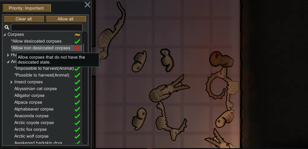 Introducing filters for desiccated corpses, this is no longer an issue! Gone are the days of skeleton ridden fridges and freezers, allowing you to not only forbid dissected corpses from them, but also making it so a dedicated storage or stockpile does allow the remains.