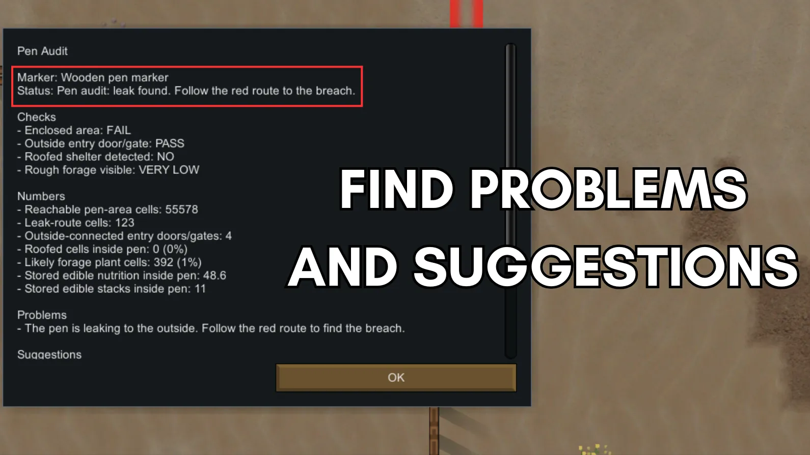 Vanilla will tell you when a pen is invalid, but it does not do much to show [i]why[/i]. This mod adds a simple audit tool directly to the pen marker so you can check the enclosure, spot leaks, confirm outside access, and get a quick read on shelter and visible feed conditions.
