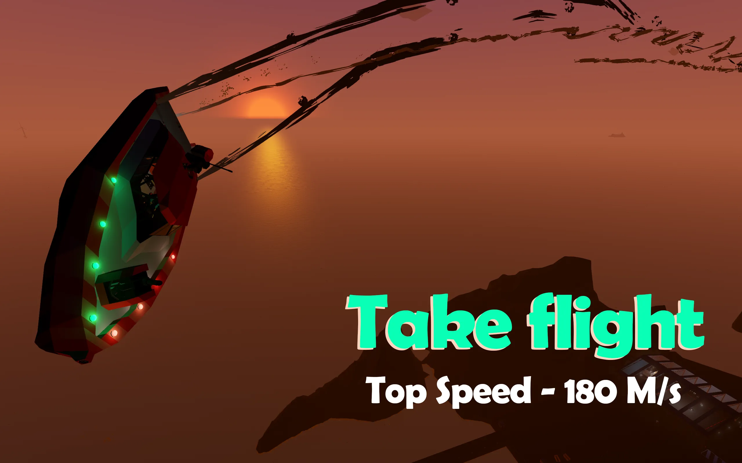 You can alternatively, however, activate the use of water tanks rather than solely ocean water, making for good de-capsizing measures, hydrofoil stabilization, and full-on flight. While somewhat unwieldy, the Oxblood is capable of respectable control over flight and extremely high speeds, an average top speed of 165 M/s but upwards of 200 M/s in the best possible weather conditions.