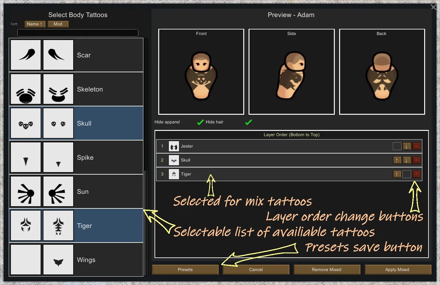 [b][i]Enjoy creating unique pawns with custom tattoo combinations![/i][/b]