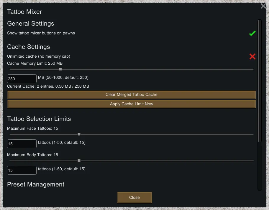 - Set maximum tattoos per pawn (default 15, up to 50)