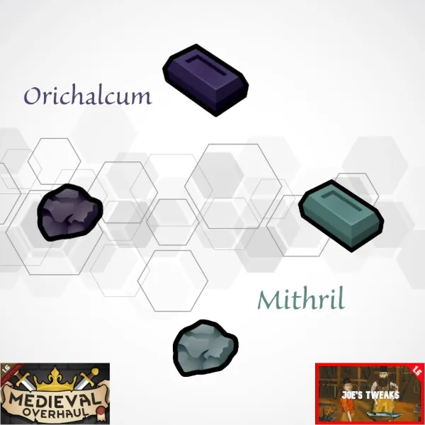 Joe's Tweaks adds the smelting recipes for Orichalcum to the "Plasteel" research project (renamed "Mithril" by MO). As the project now includes more than just mithril, I changed the research project label to "Advanced Metallurgy" and updated the description to include both metals. Joe's Tweaks also adds both ores to the MO mine shaft but only as a work intensive single ore. I added in the bulk recipes and adjusted the work values to something I find more reasonable while also being more laborious than other metals.