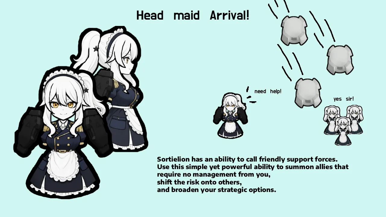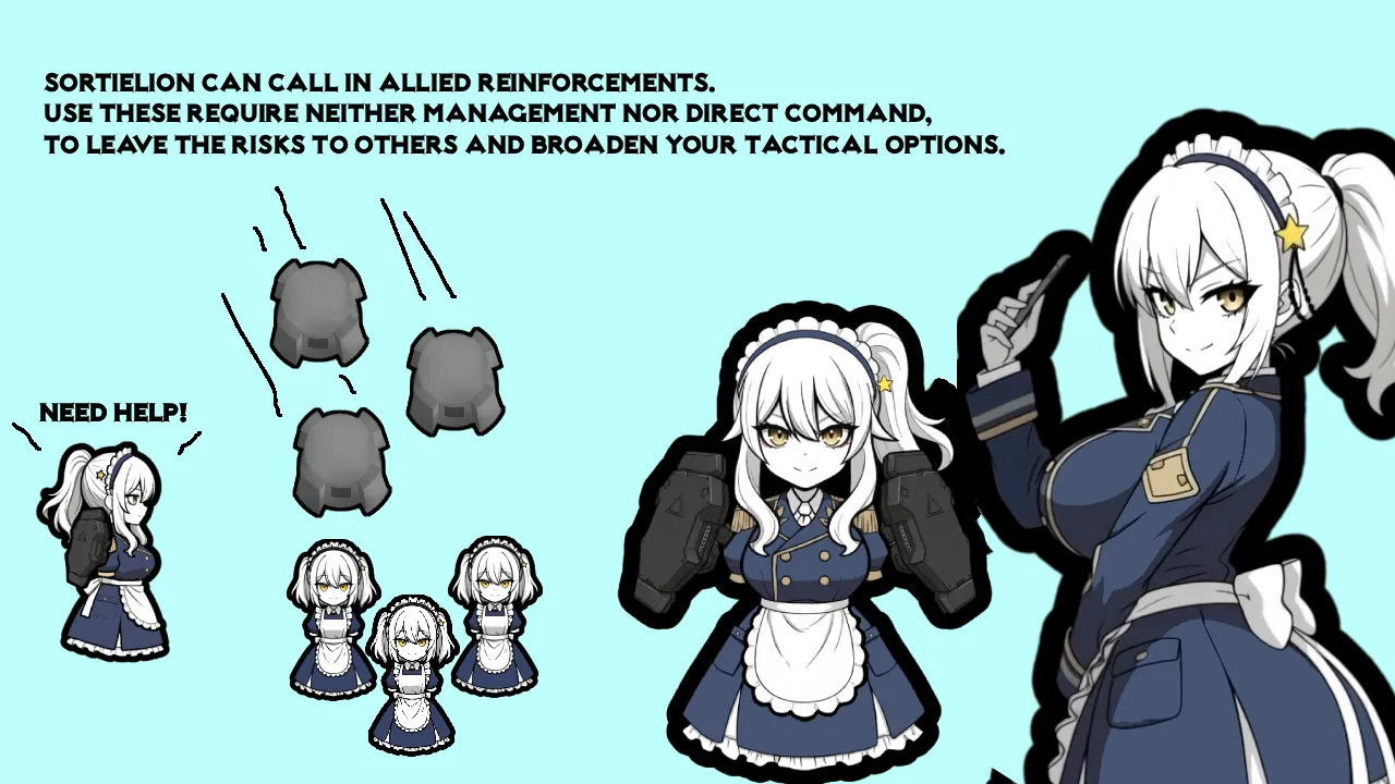 Sortielion has an ability to call friendly support forces. Use this simple yet powerful ability to summon allies that require no management from you, shift the risk onto others, and broaden your strategic options.