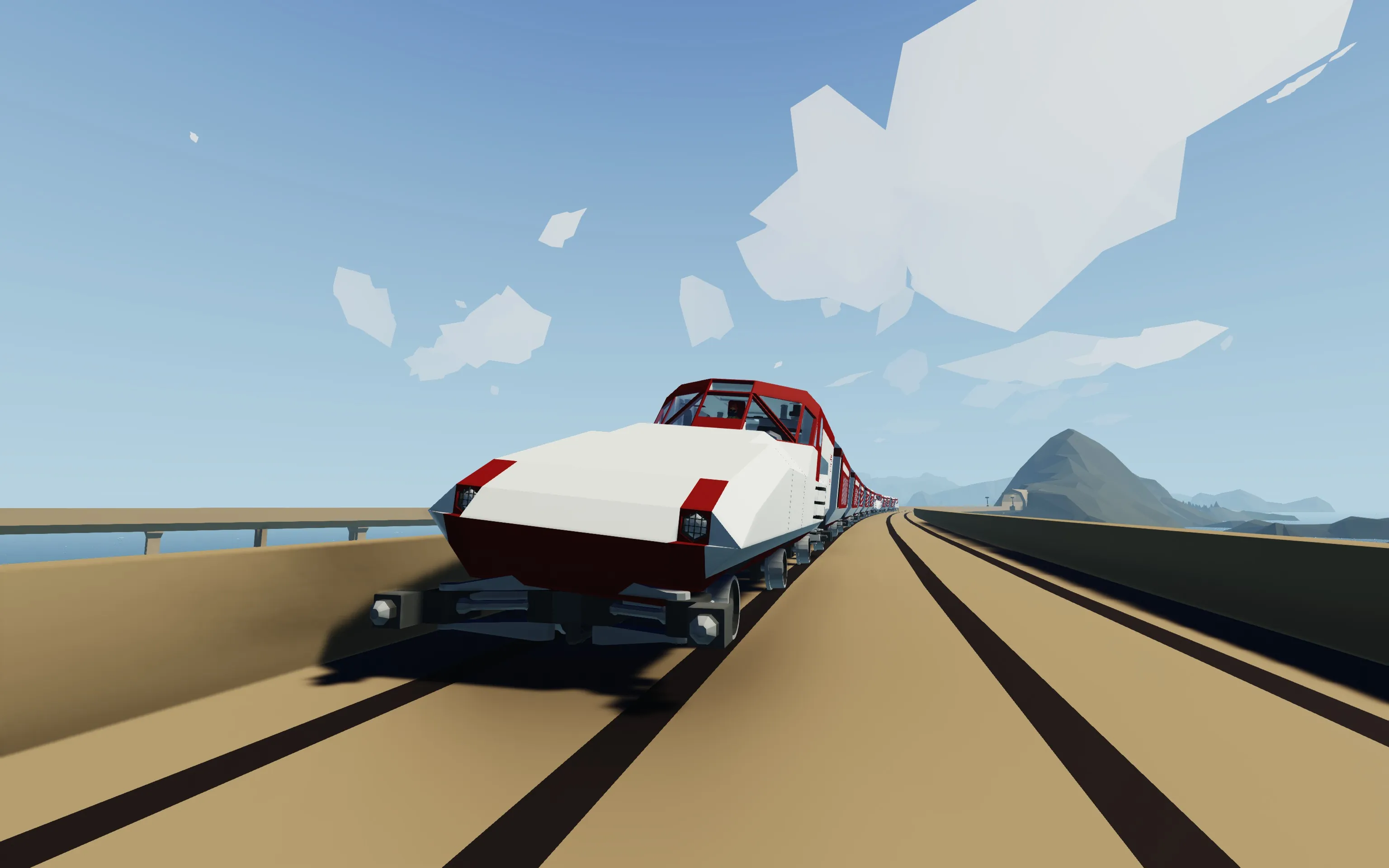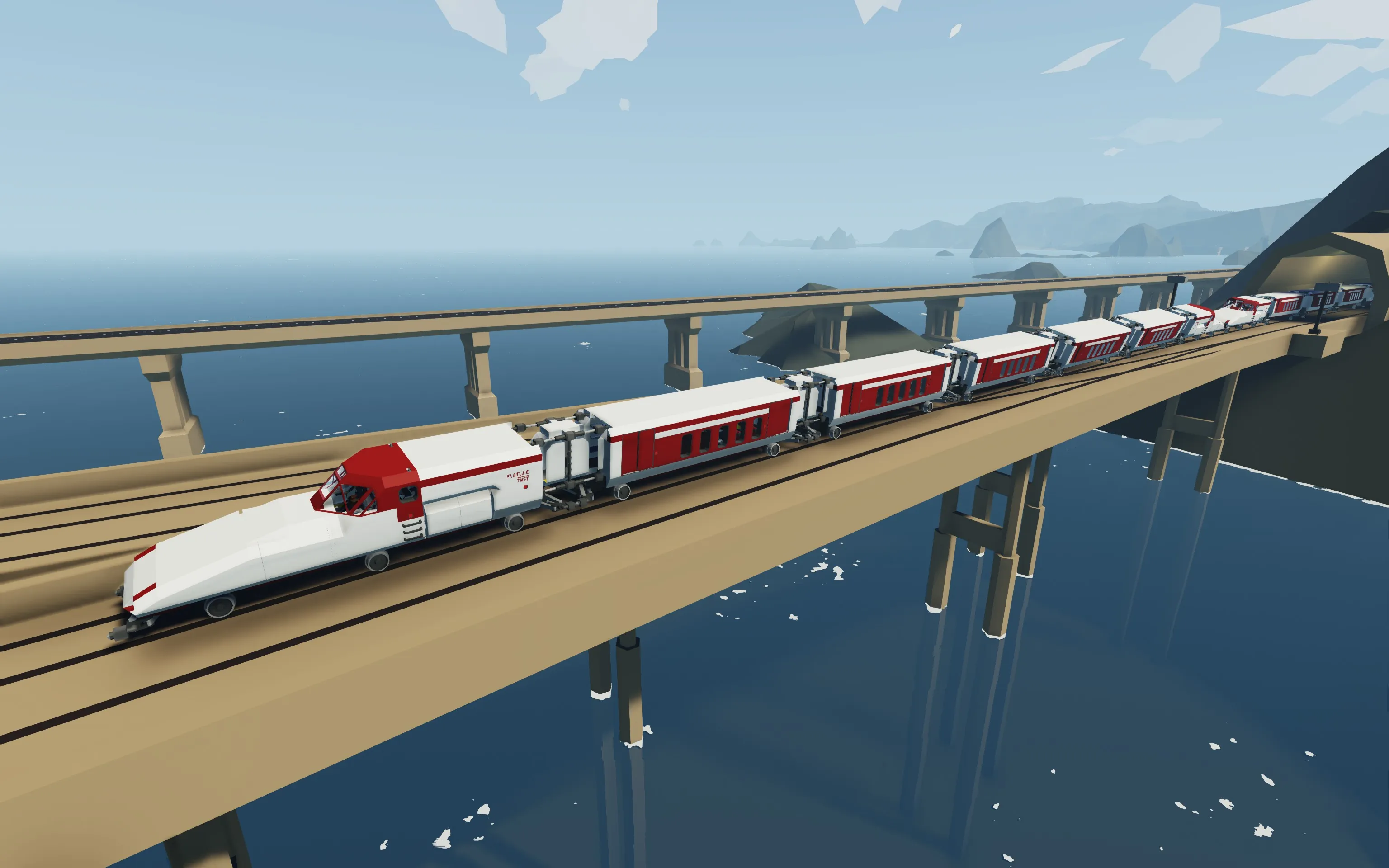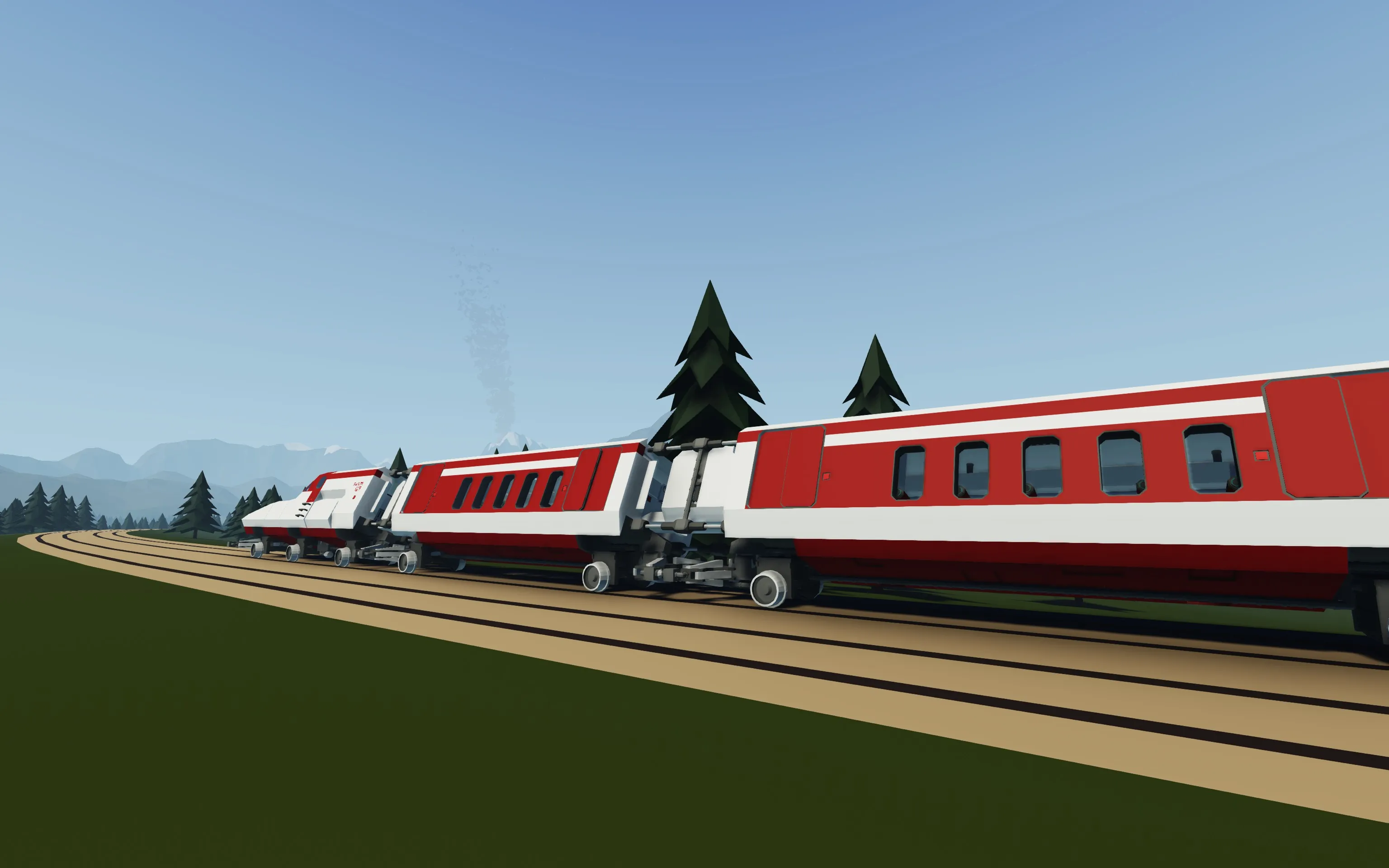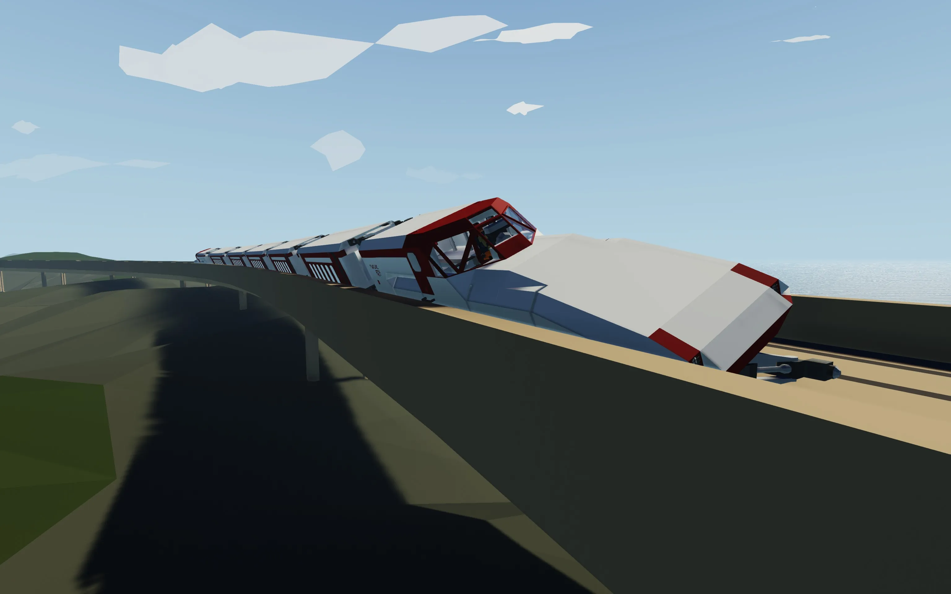 Flatline Tilting High Speed Train is specifically designed to handle tight Stormworks curves without slowing down. Inspired by different real life train features for high speed rail service on non-high speed tracks, it is equipped with active 26° tilting system and weirdly long semi-fixed bogies. Flatline can pass most in-game turns without derailing at 75 m/s (270 km/h, 165 mph).
