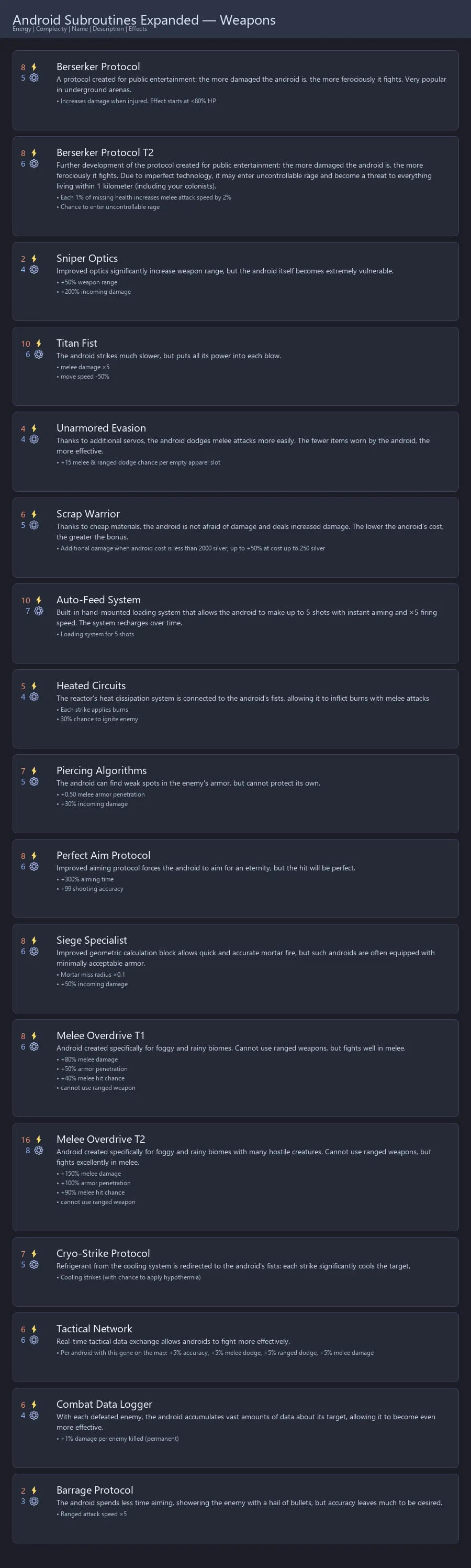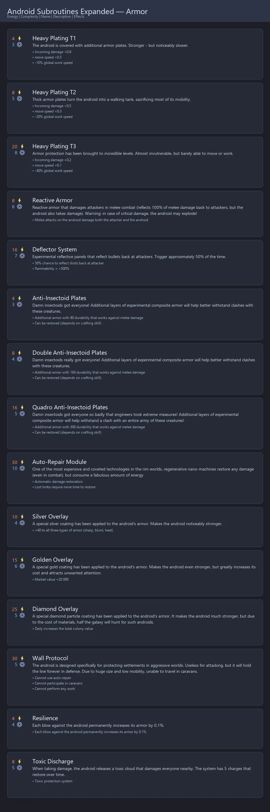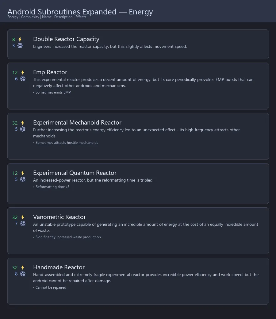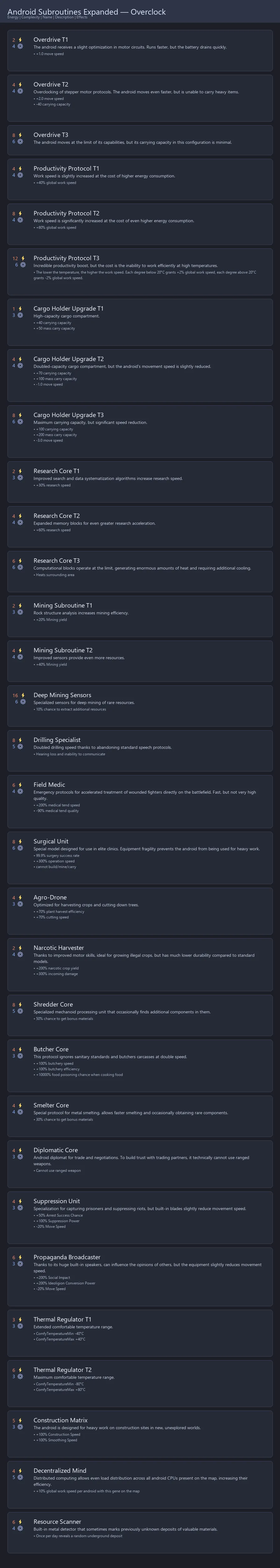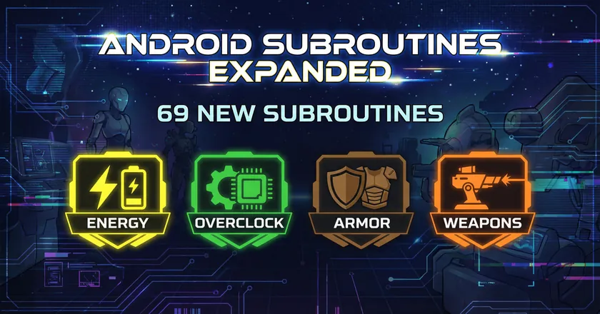 This mod adds a total of 69 new subroutines, with both advantages and disadvantages. The goal of this mod is to make the android creation process deeper and more interesting, as well as introducing new mechanics to the game.