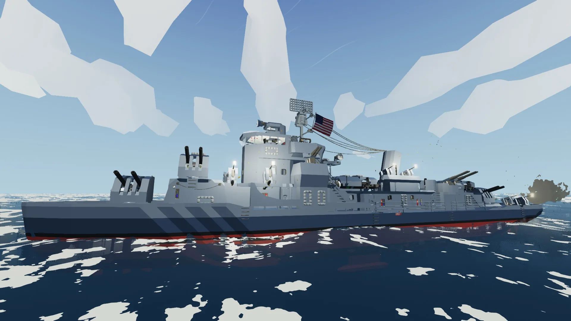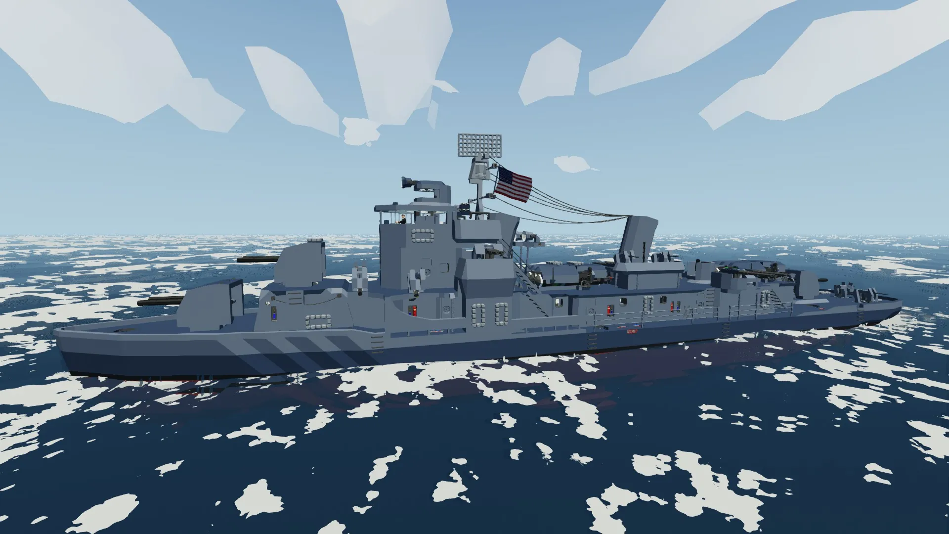 This is an approximation of an Allen M. Sumner-class destroyer, She is using USN Ship Camouflage Measure 22, "Atlantic two-tone.”