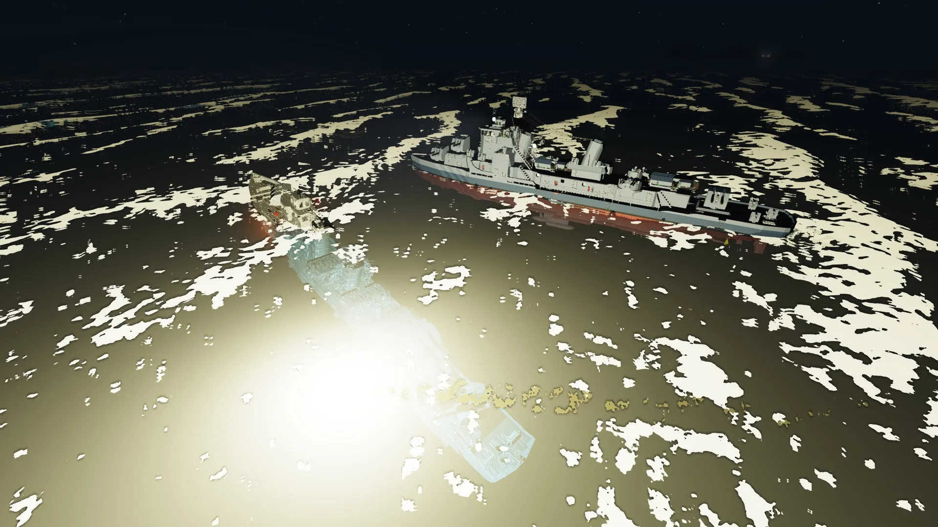 -Search Radars are controlled left of the Helm, on at spawn and have separate radars for air and surface targets. Surface targets will show red on the screens, and air targets yellow. Very low flying air targets will show red. Each gives a different beep when detected. The Map display on the Starboard side of the bridge is by default displaying air search radar targets, but this can be changed with the button aft of the map panel