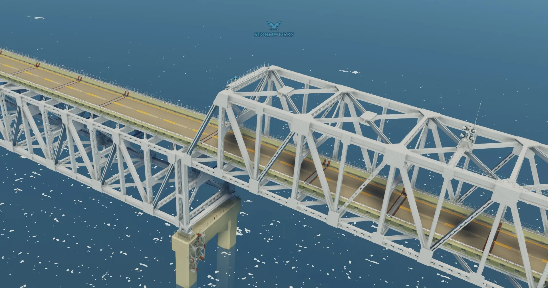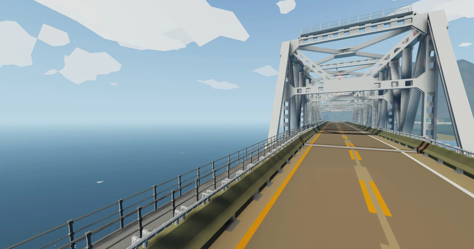 This is a bridge that spans the Frantic Bay. It is the successor to my first one. The highway connects to the fishing village road and it then crosses the bay before ending on the other side. The bridge has a concrete causeway section before transitioning to a continuous truss approach. The main span is flanked by large continuous deck trusses. The bridge takes heavy inspiration from the Chesapeake Bay Bridge.
