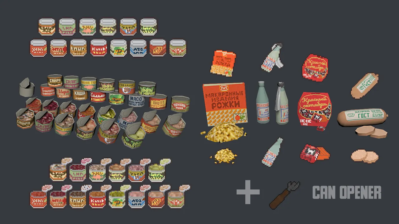 A collection of household items, tools, weapons and food from the post-Soviet space! The pack will be constantly updated with new types of items and updated regularly. It works stably in the release version of the game 41.78. With beta versions, errors may occur, food and items may not be displayed correctly, and some functions may be missing.