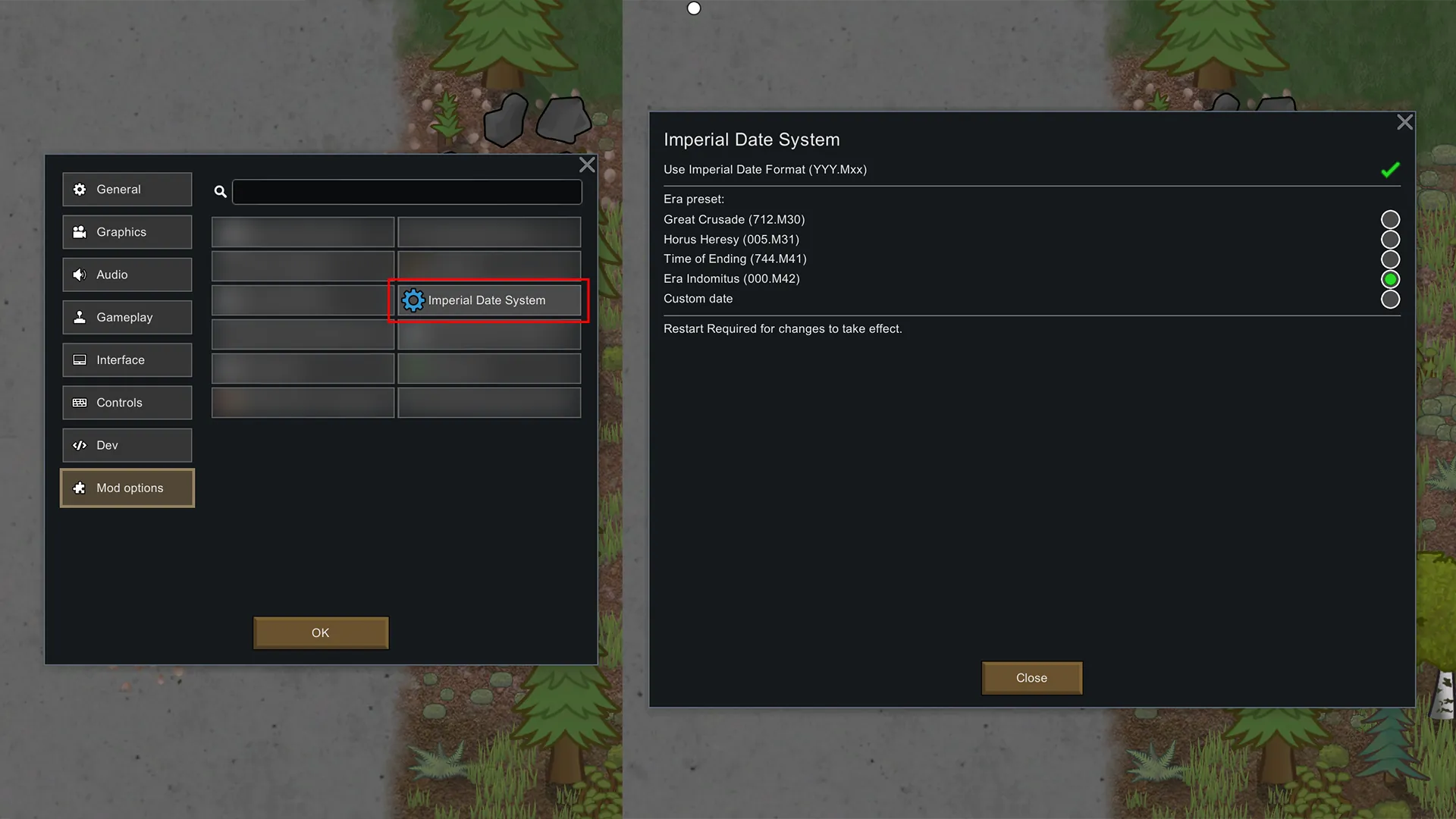[*] [b][i]TwoLargeGayMen's[/i] "Imperial Date System"[/b] - Modifying the standard year system of RimWorld, to display a Warhammer 40,000 stylized year system. You are able to pick a variety of years as well as fully customize the displayed date, just remember to save and reload your game for it to be displayed.