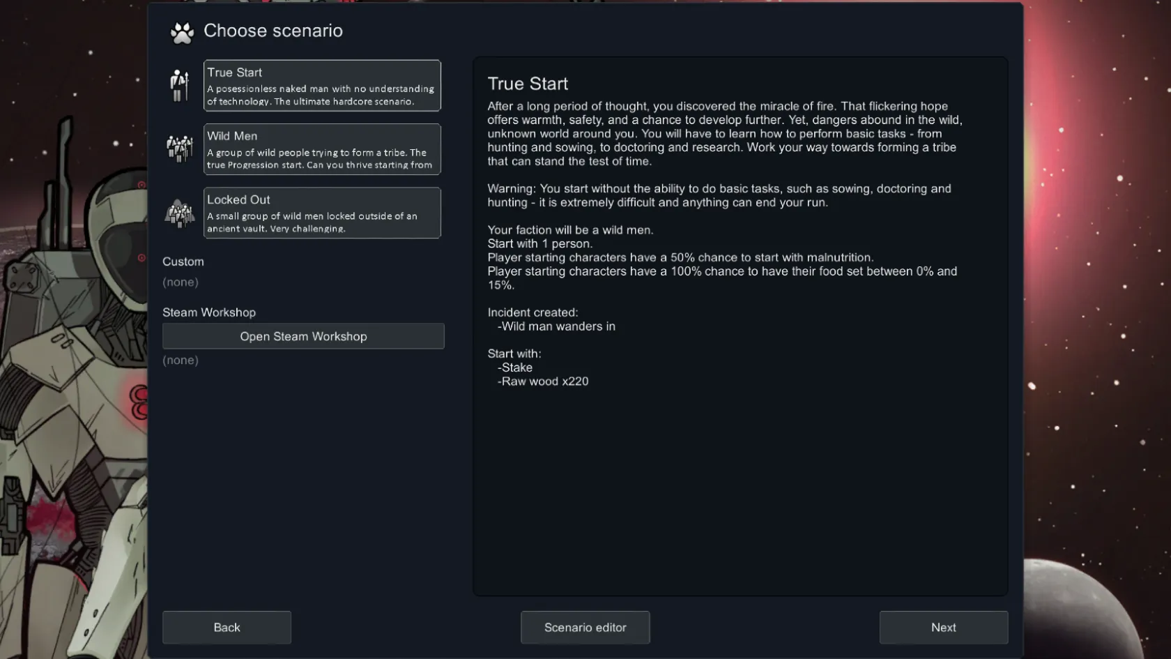 [*] Are there Archotech scenarios out there? | I don't know any mods that add scenarios to Archotech, but they're there for the future.