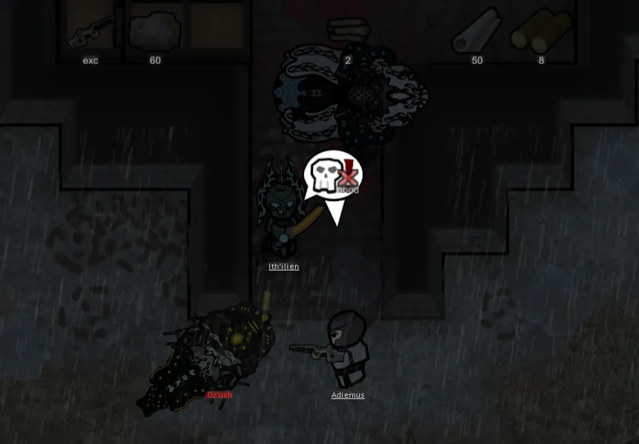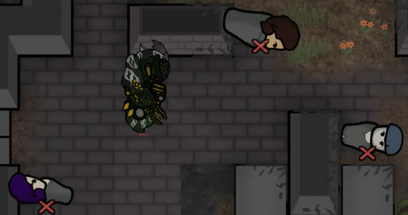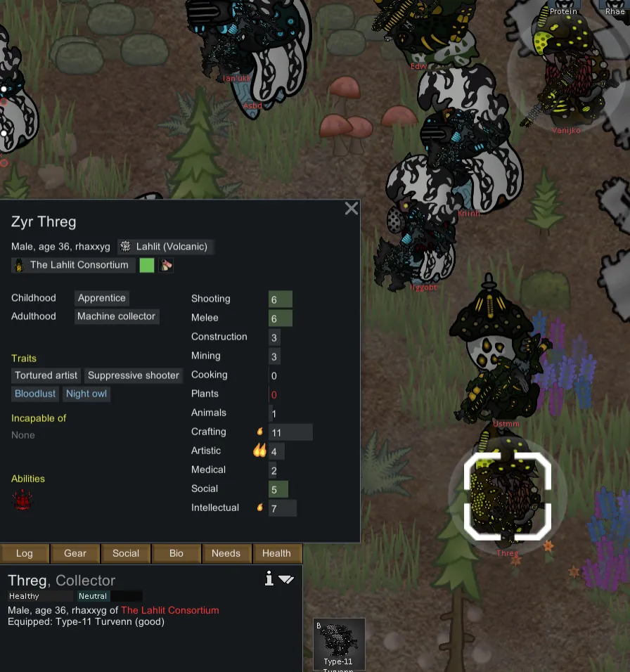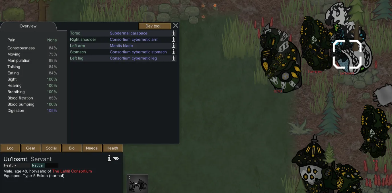 As for gameplay...they'd, like the Oksarzj, have to be very different from anything else in the game, and my new goal was to make a more mechanically in-depth army. How about...we do the exact opposite of Warhives? Instead of hordes of screeching bug-people who die in 2 hits, this faction instead fights with strike teams of heavily armored "alien Space Marine" type enemies like Cabal or Grineer? And of course, this is a [i] cyberpunk [/i] megacorporation...meaning the Lahlit would be borged as all get out, every single one of them being chipped with stuff the Grineer [i] wish [/i] they had. It's a fun concept for a RimWorld faction-the base game enemy armies are all pseudo-human wave fights. Warhives just took that to 11. Now Consortium's here to completely do away with that.
