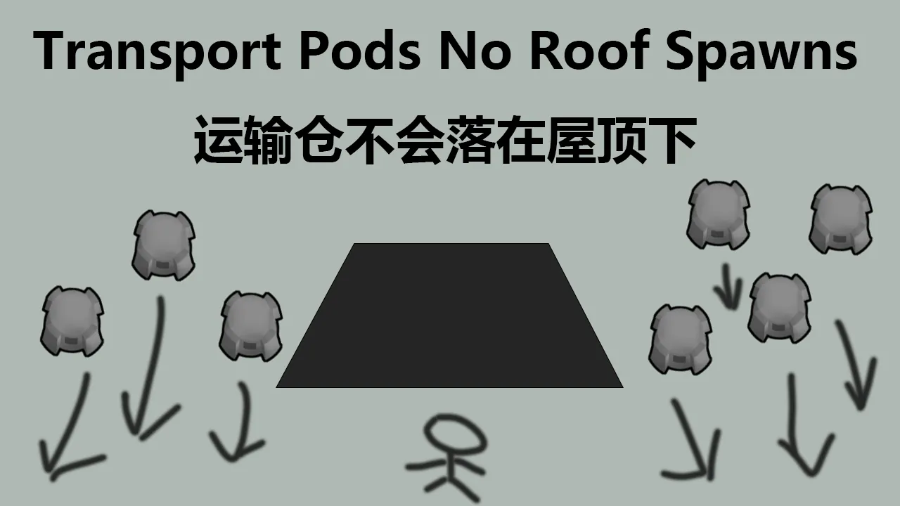让空投仓在选择落点时不会认为具有屋顶的格子是可以降落的。 Make Transport pods not consider roofed tiles as valid landing spots when they select their landing positions.
