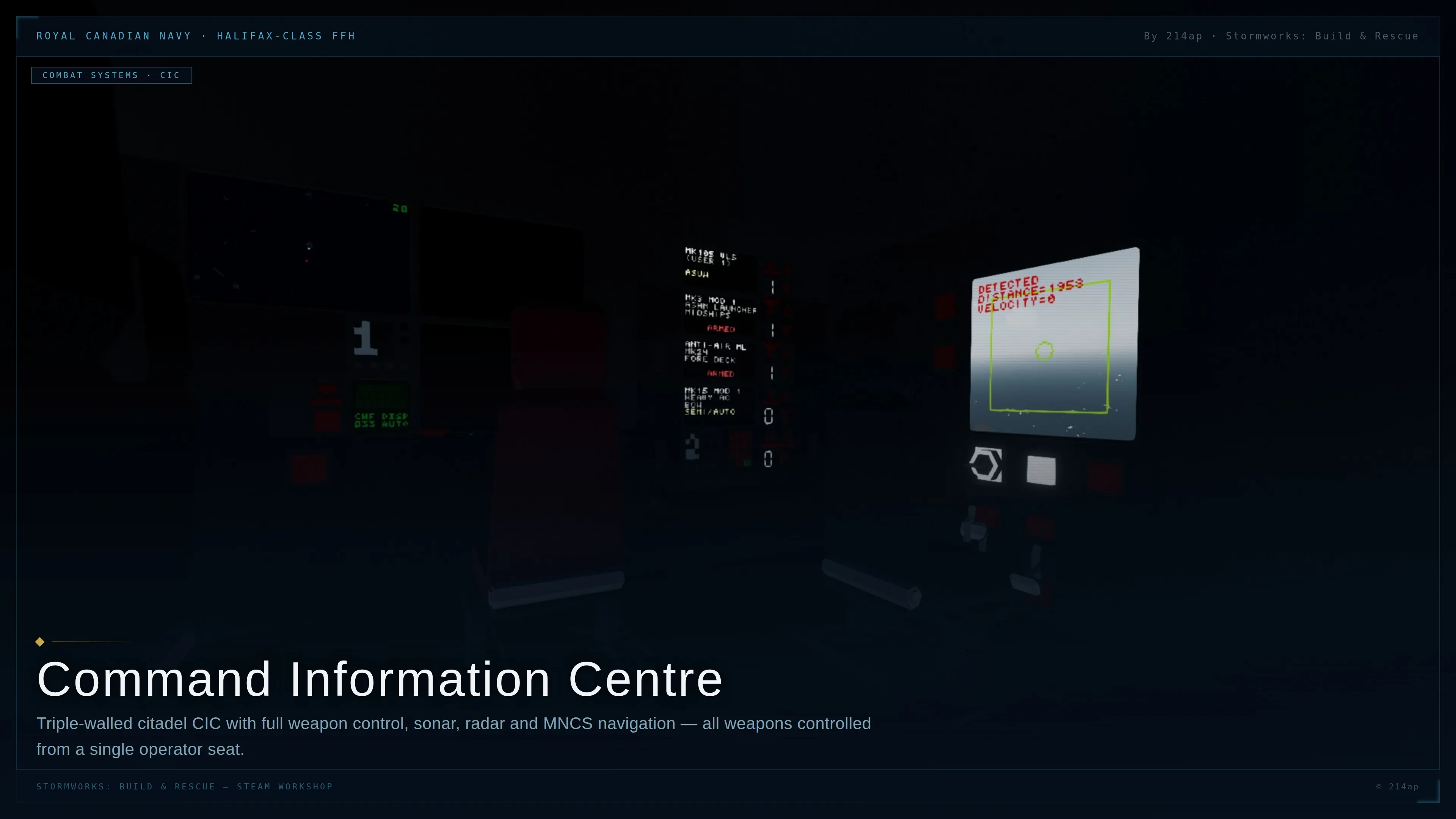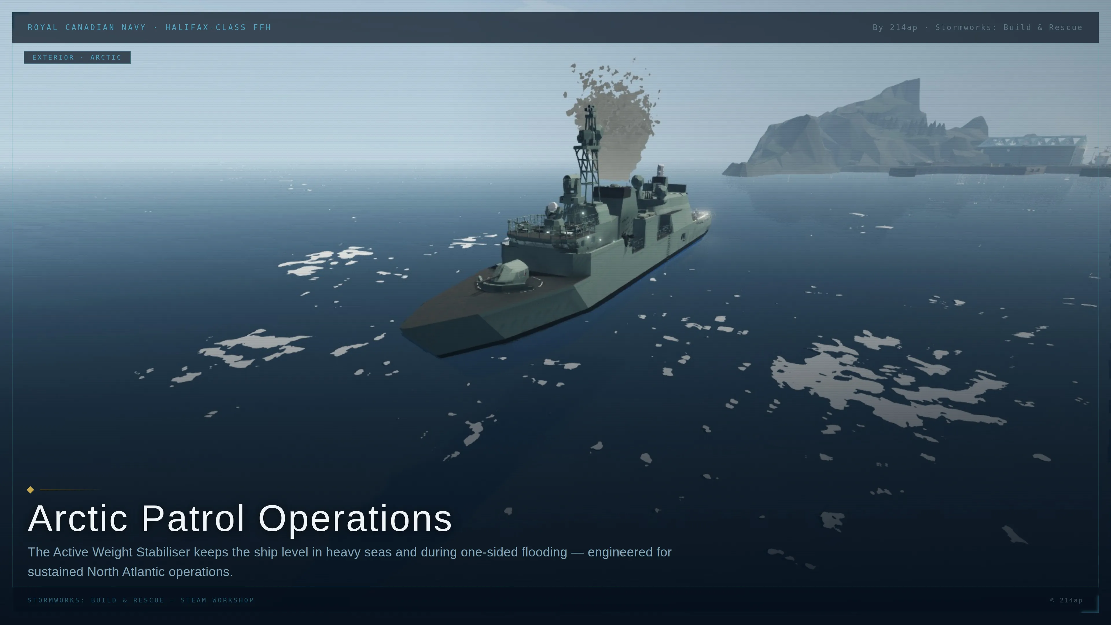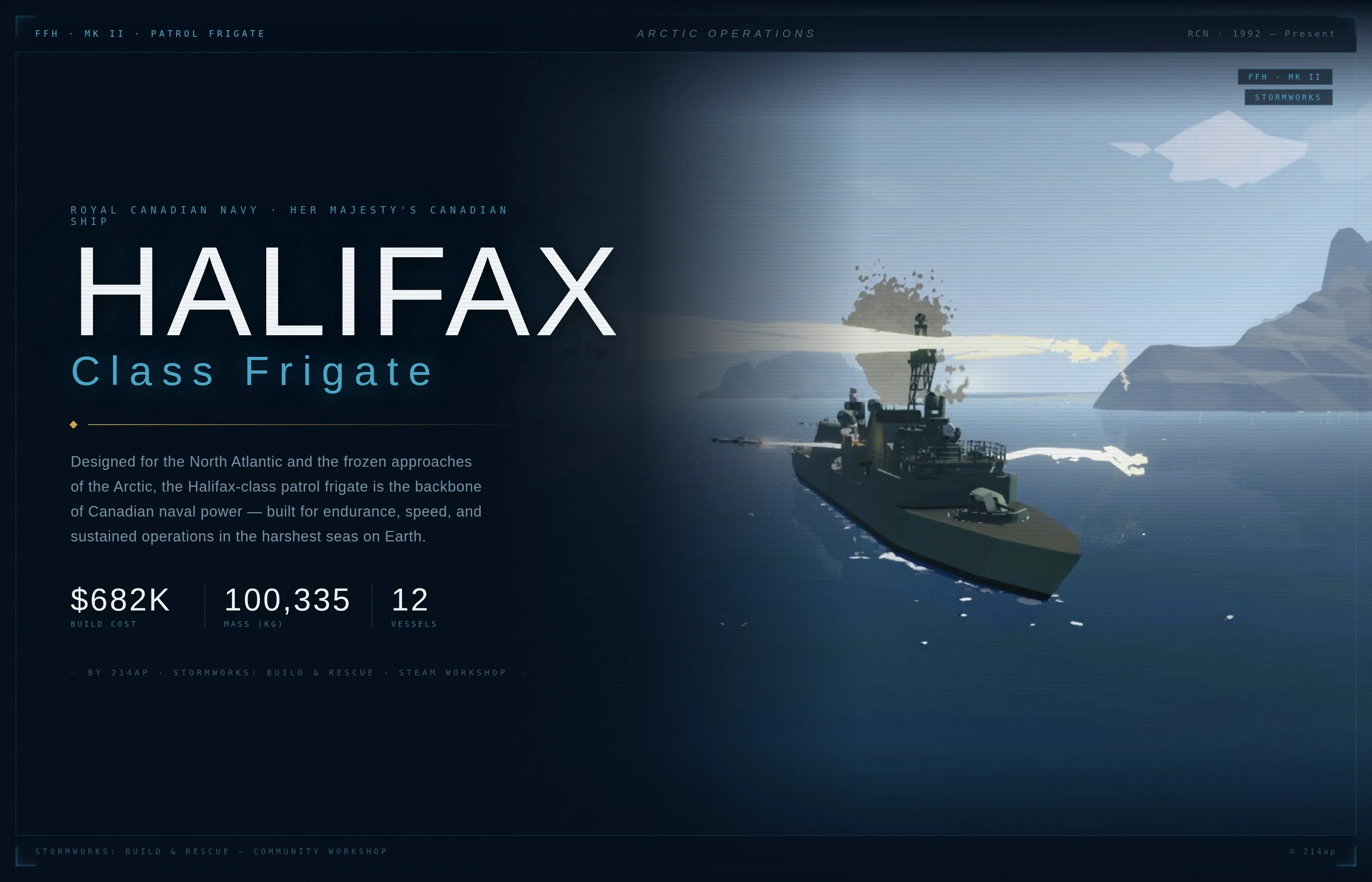 The Halifax-class frigate — also known as the City class — has been the backbone of the Royal Canadian Navy since 1992. Born from the Canadian Patrol Frigate Project of the mid-1970s, HMCS Halifax was the first of twelve Canadian-designed and Canadian-built vessels, combining anti-submarine warfare with surface and air defence capabilities. Now, she's yours to command.
