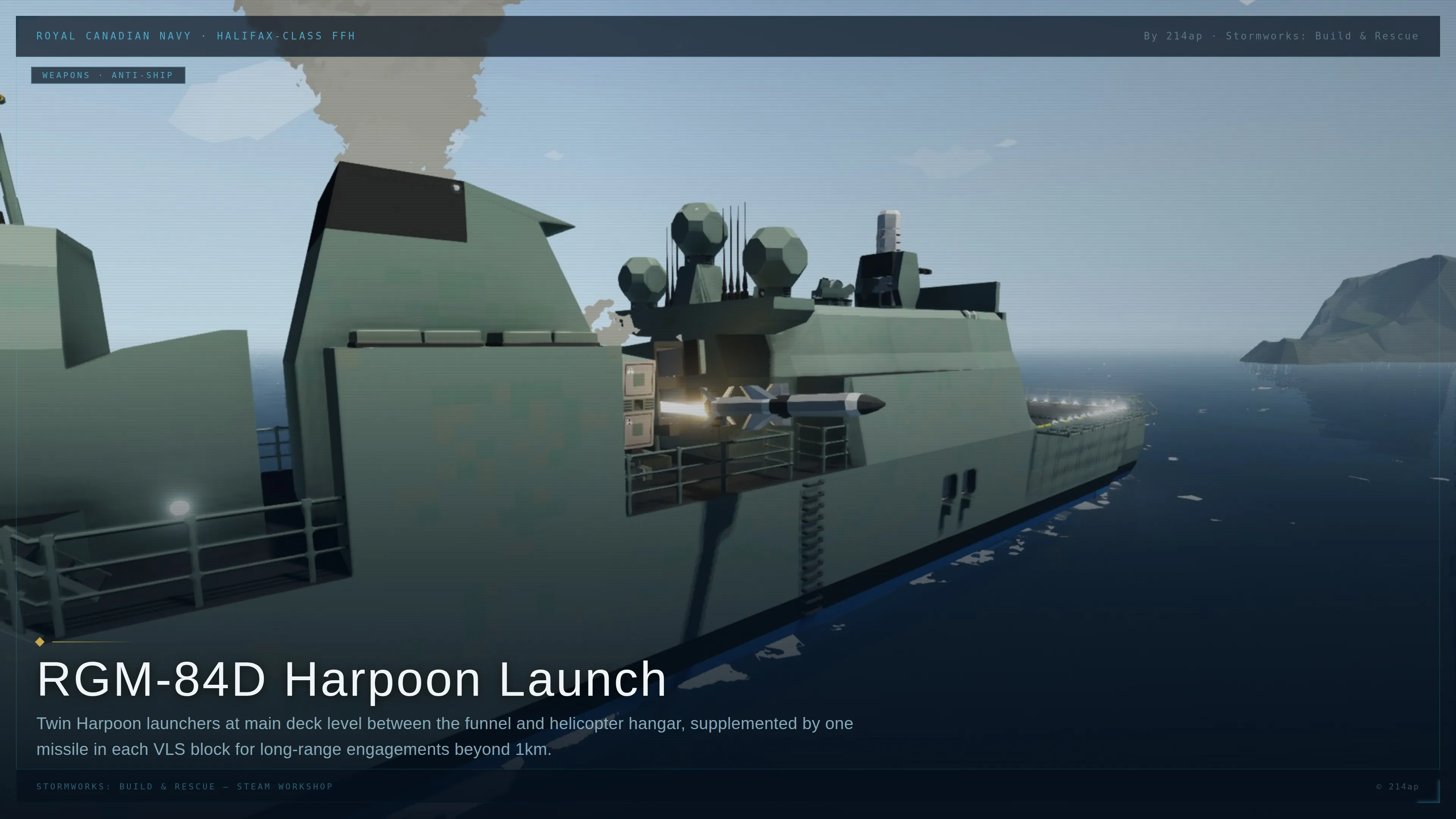 RGM-84D Harpoon Block 1C missiles (Jarrmarine) — two twin-launch tubes at main deck level between the funnel and helicopter hangar, plus one missile in each VLS block for long-range engagement (1km+). A single Harpoon hit will sink most vessels; this Halifax can survive three or more thanks to its damage control systems.