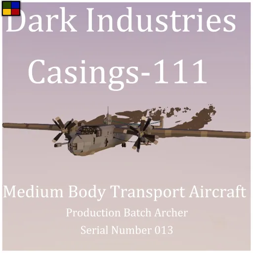 The Casings Triple One (or 111) is a twin engine aircraft with coaxial propellered first went into production into 7th of March, 1938. Designed by Casings Aircraft Designer Team in 1937. This aircraft was designed in the 5 year transition period of Dark Manufacturers to Dark Industries, thus bearing the modern Dark Industries Symbol instead of the Dark Manufactures Square.