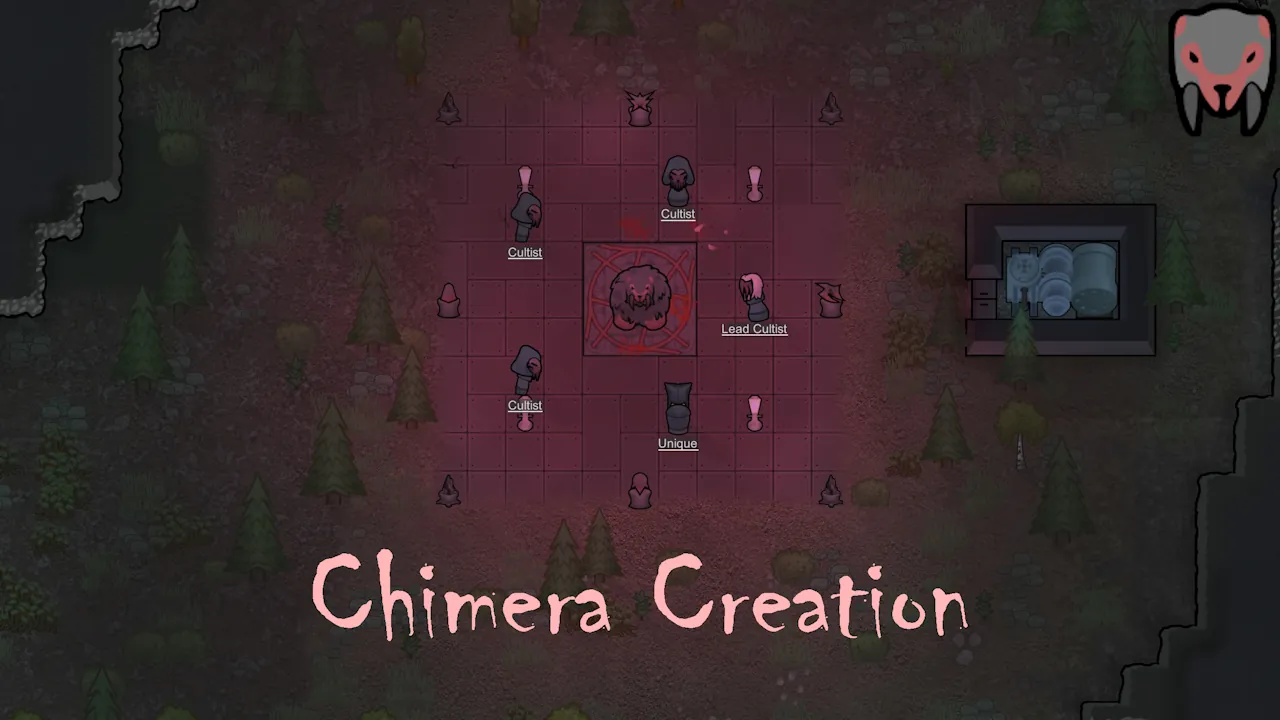 This mod adds a psychic ritual that turns animals into friendly chimeras. They can be used like normal animals with advanced trainability, but can only eat raw meat and corpses and will become hostile if not fed. Includes one new prosthetic for your tame chimeras, some mod settings, and cross-compatibility with More Archotech Garbage to let you tame wild chimeras!