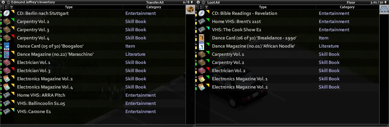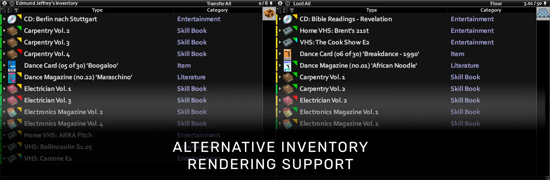 [*] [b] Automatically support for any mods that adds new skill books, recipes magazines, vhs, home-vhs or cd (these items will have same category in menu as vanilla items)[/b]