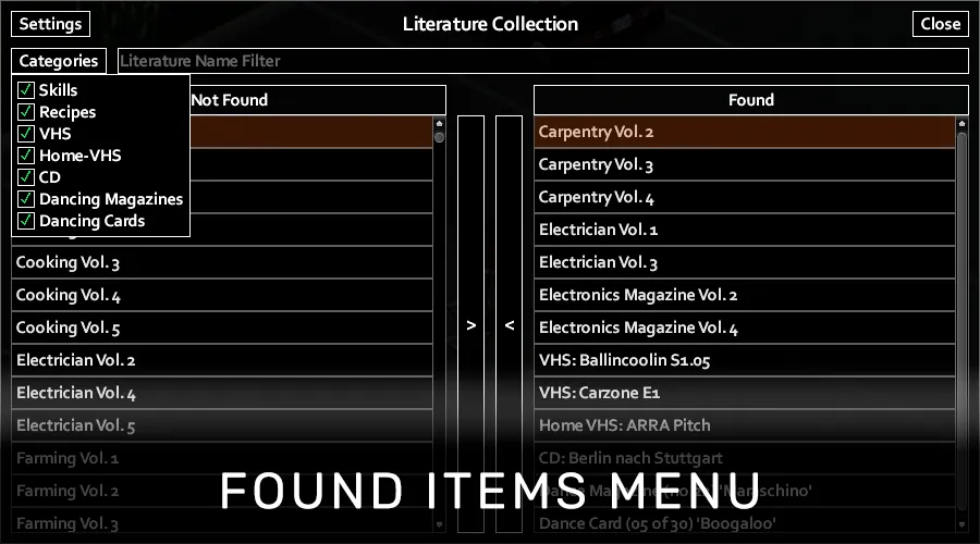 [*] [b]Menu with 2 Lists of all Found and Not Found Literature Items:[/b] The mod comes with a menu that displays two lists of all the literature items you have found and the ones you haven't. This makes it easier for you to keep track of all the literature items you have collected.