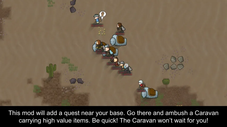 [*] With this mod, every XYZ days (configurable in the settings menu) a quest will be launched near your base. Your task is to ambush a Caravan traveling through there to seize their high value cargo