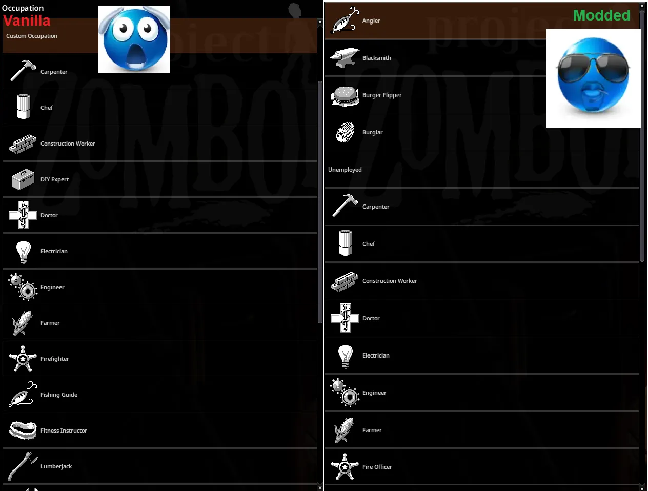 Brings back some of the B41 profession and trait names. Changes: - (Profession) Custom Occupation ---> Unemployed - (Profession) DIY Expert ---> Repairman - (Profession) Firefighter ---> Fire Officer - (Profession) Welder ---> Metalworker - (Profession) Fishing Guide ---> Angler - (Profession) Security Guard ---> Security Officer (Personal change, was not in B41) - (Trait) Reluctant Fighter ---> Pacifist Workshop ID: 3702790209 Mod ID: B41ProfNames