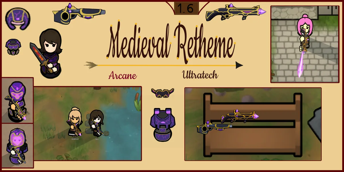 This mod rethemes the ultratech charge weapons and power armor into an arcane fantasy style for medieval settings