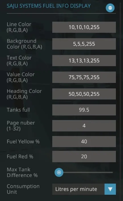 This is a simple fuel panel for vehicles that have two separate fuel tanks. Made for a 3x2 monitor. The controller has customisable colors. This controler can provide a range output signal for the [url=https://steamcommunity.com/sharedfiles/filedetails/?id=3703052147] Saju Systems Engine Panel. [/url]