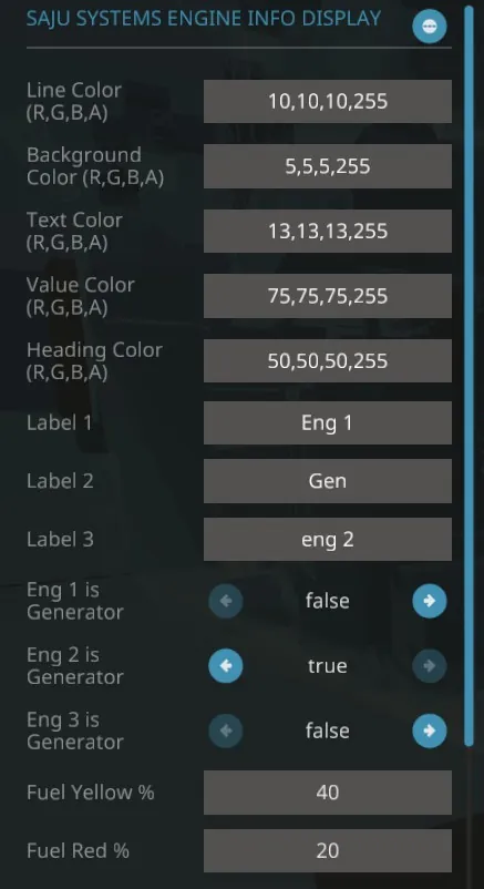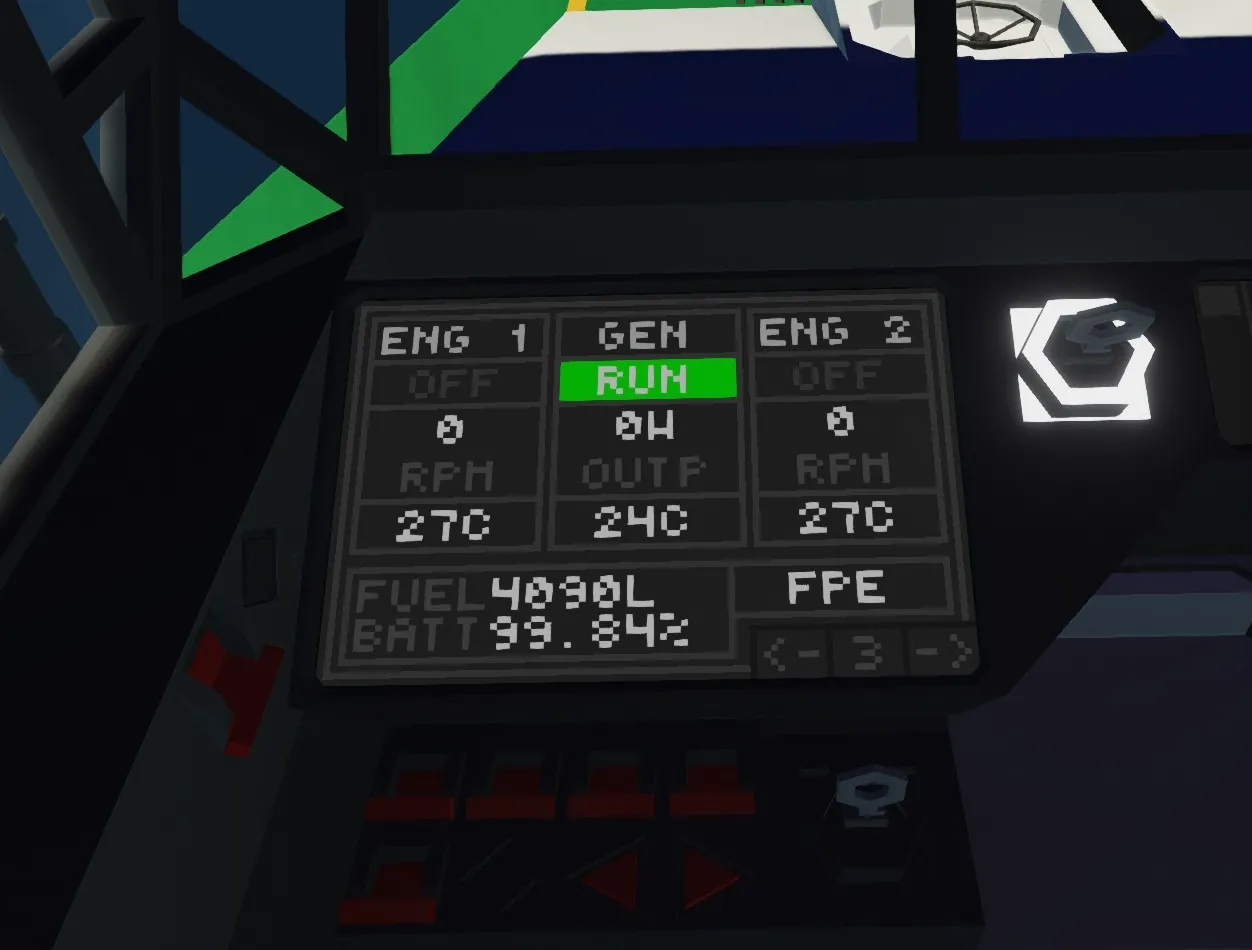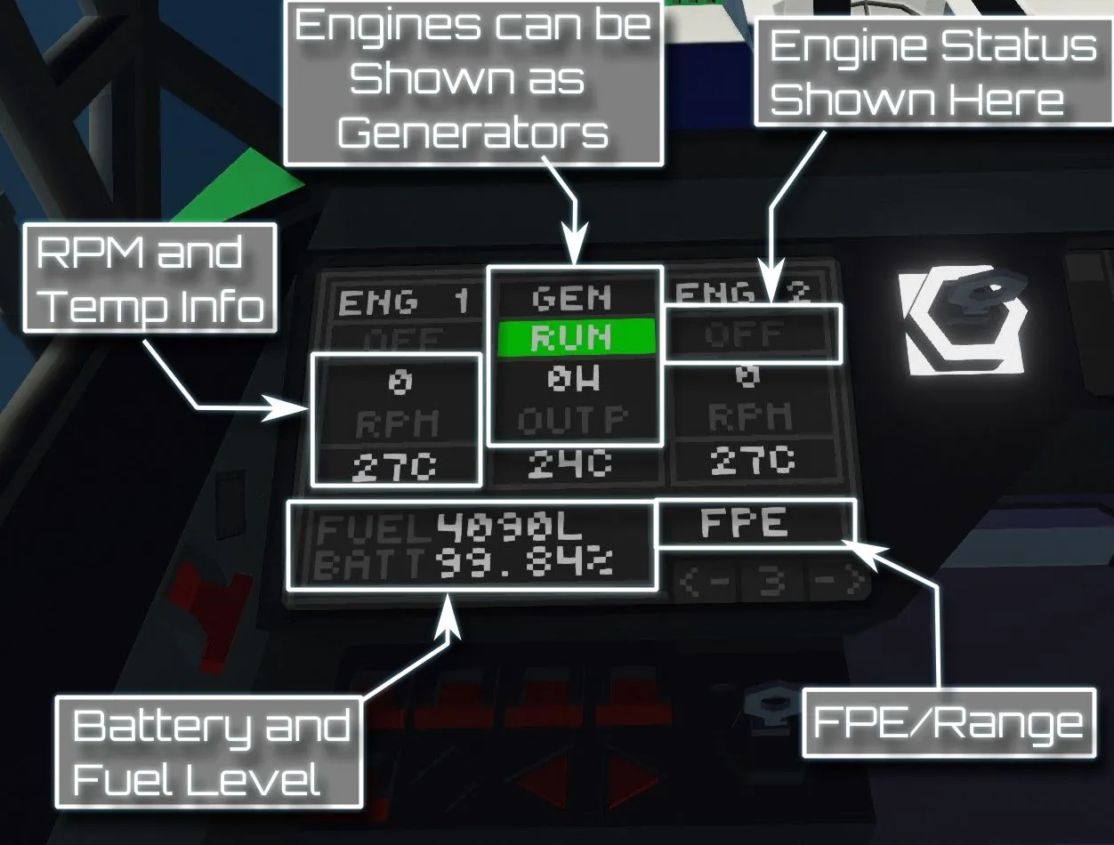 This is the first marine engine display by Saju Systems. It is designed for 3 engines. Any or all of the 3 can be switched to generator in the properties. This Controller works [b]ONLY[/b] with the [url=https://steamcommunity.com/sharedfiles/filedetails/?id=3677341187] Saju Systems Modular Engine Controller[/url]. You need to have 3 generator/engines. Also having two fuel tanks is recommended but not necessary. Designed only for the 3x2 monitor size.