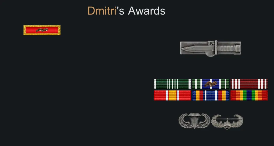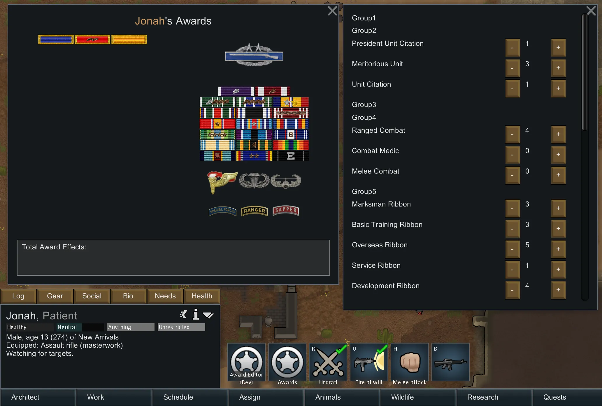 Have you ever wanted to follow each pawn's career in your colony? This mod adds per-pawn awards and achievements with an immediate display. The awards are based entirely on the US Military badge and ribbon racks and now has plenty of open space to add custom awards.